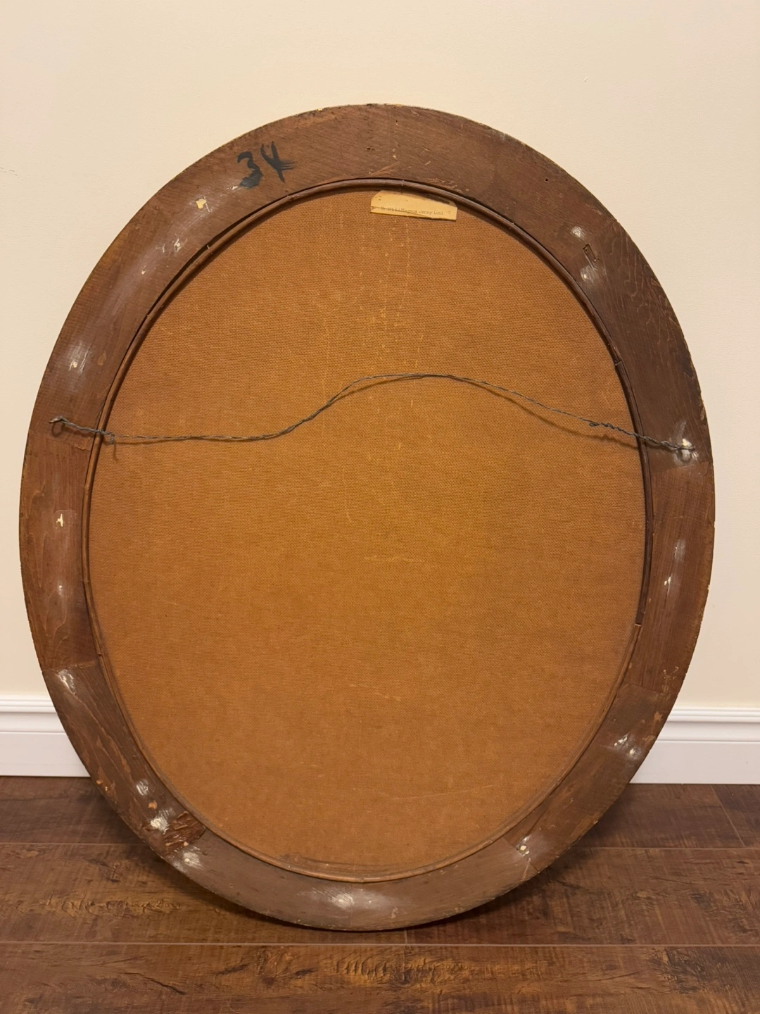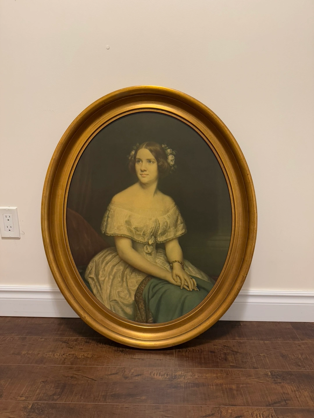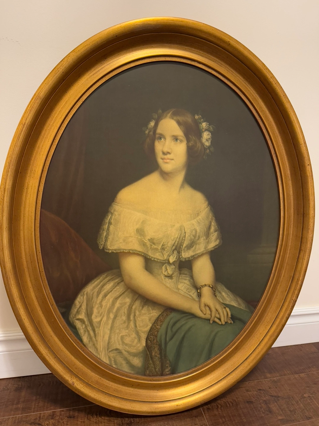 Antique-style oval framed portrait. Depicts a young woman in a period-style dress. Gold coloured frame. Large size, perfect for a statement piece.