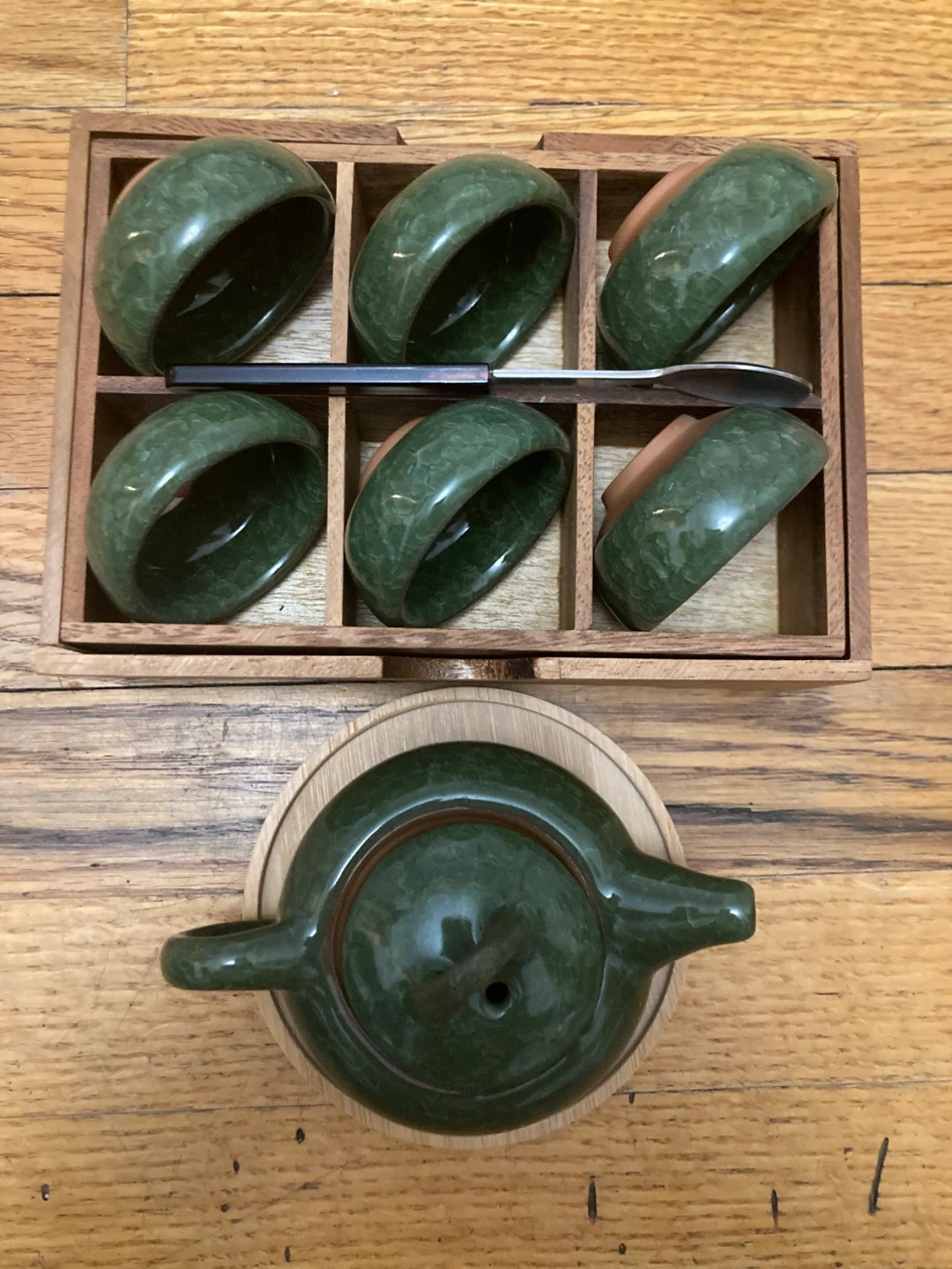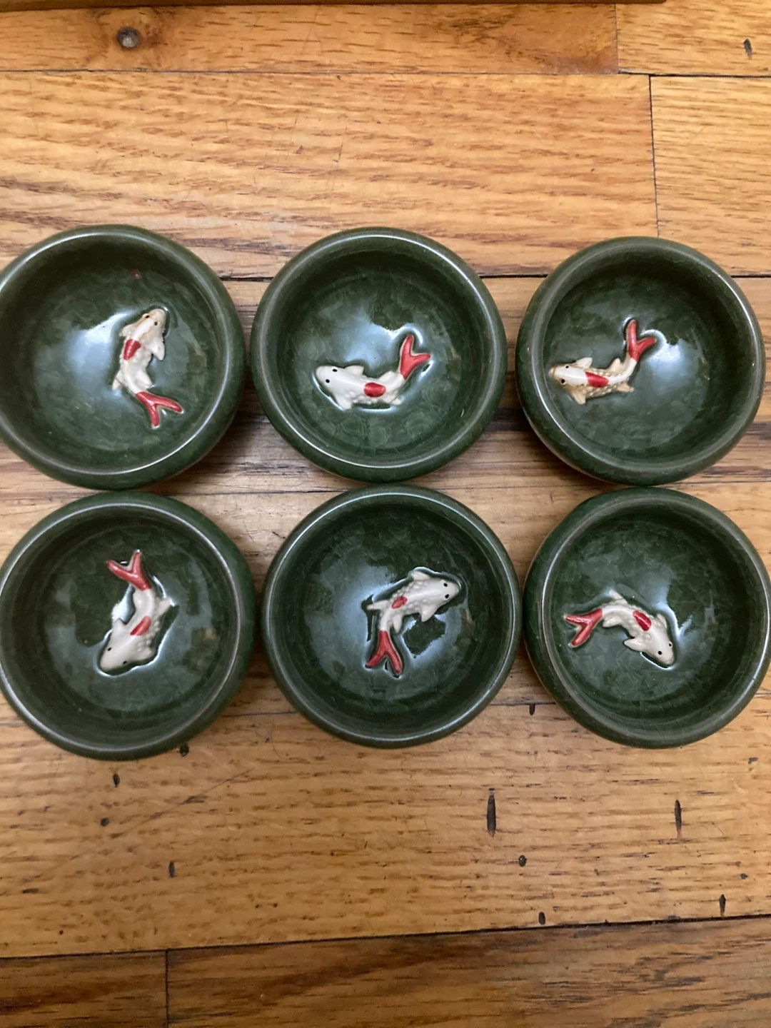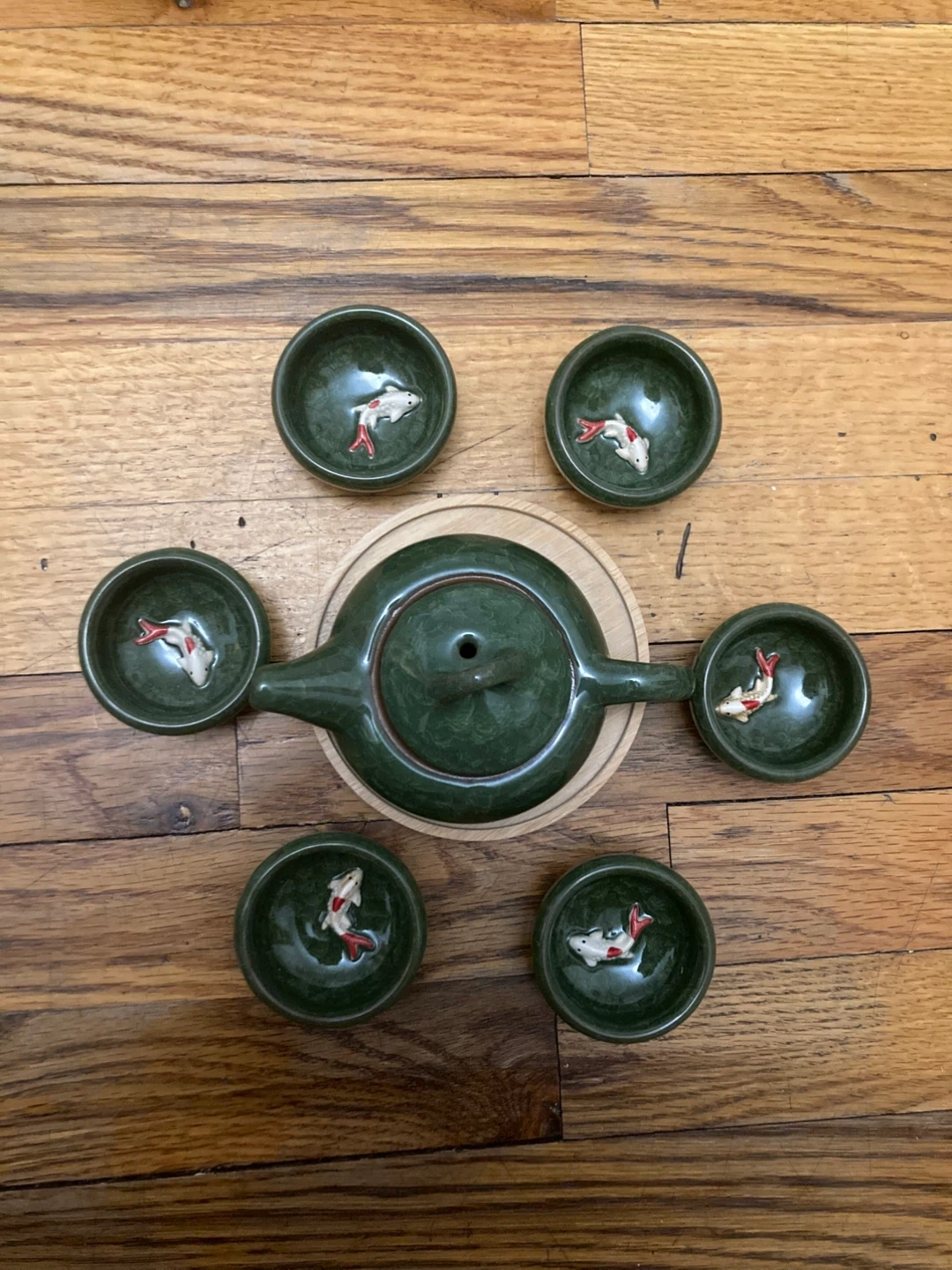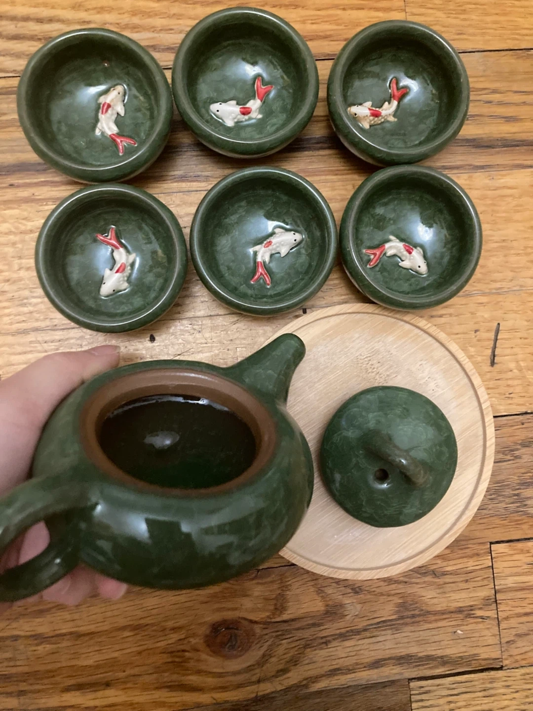 Pickup and cash only. This set includes a green ceramic teapot and six matching cups. Each cup features a detailed koi fish design inside. The teapot has a lid and a handle, and the set rests on a wooden tray. It's a beautiful addition for any tea lover!