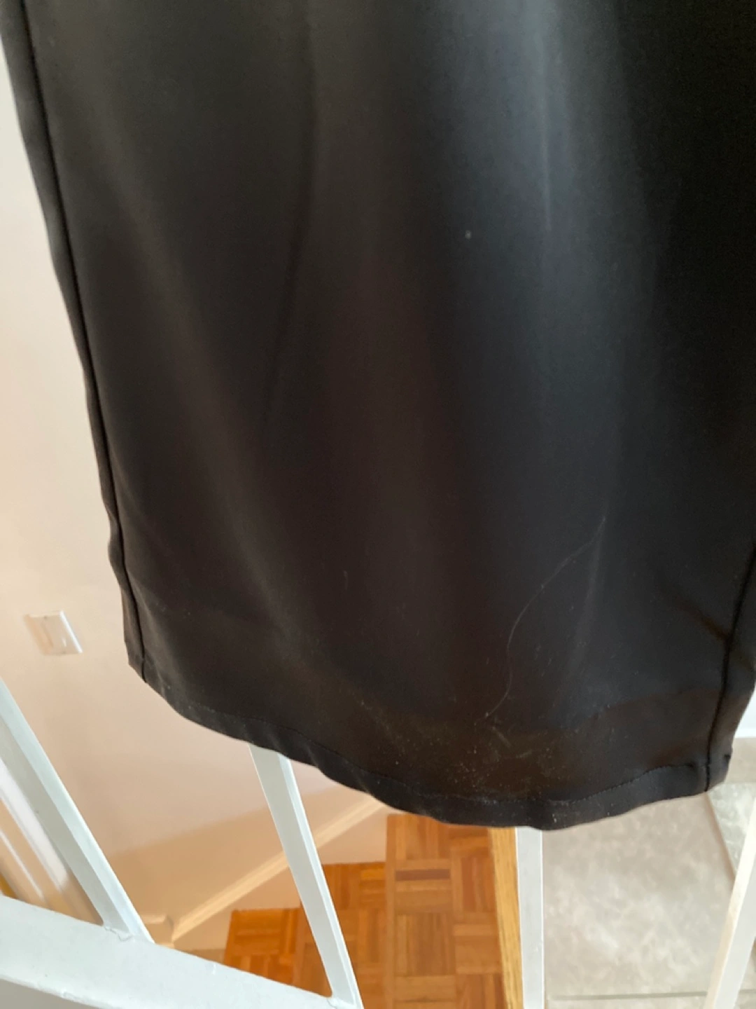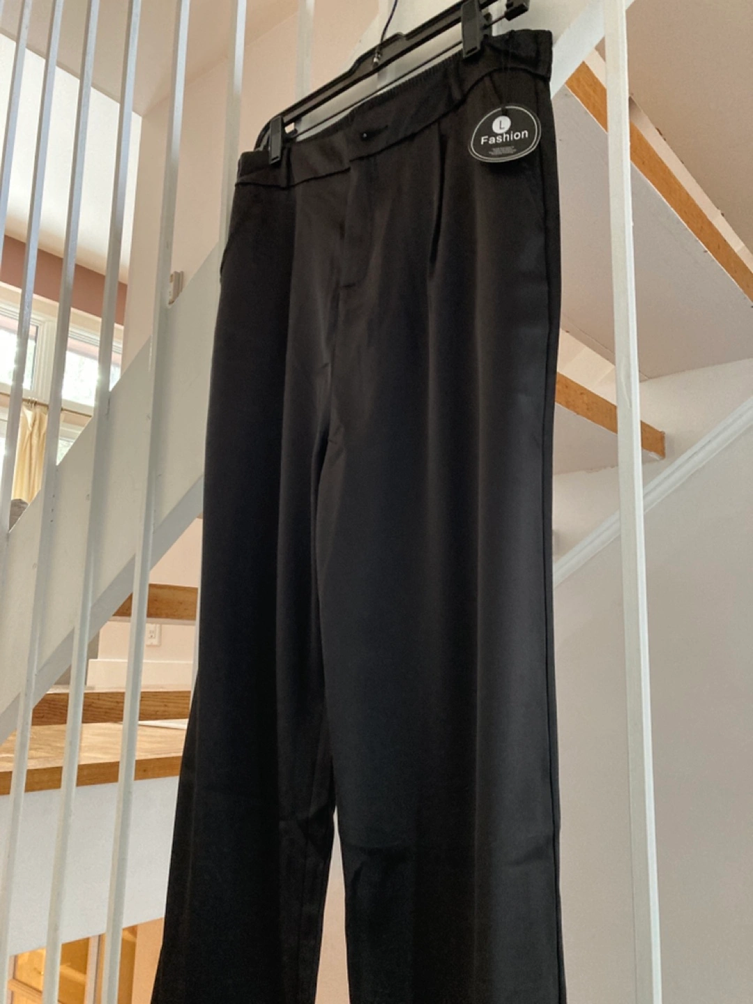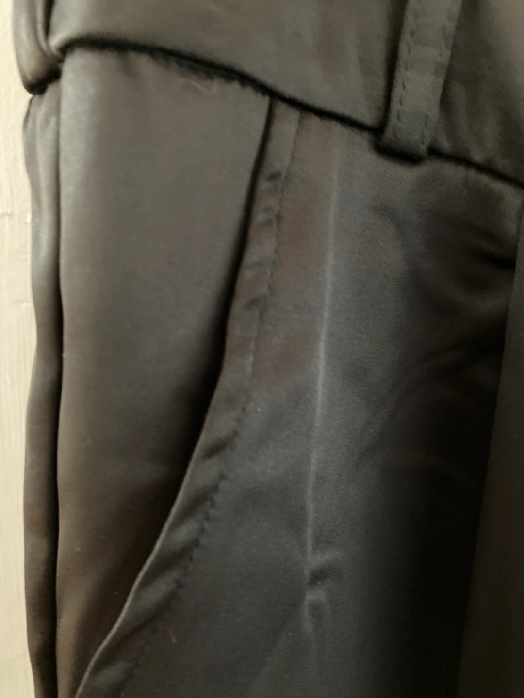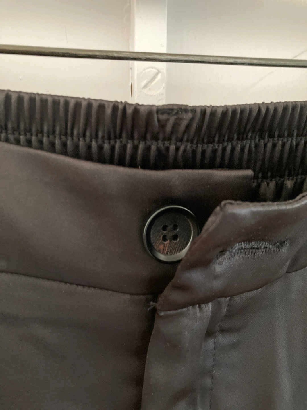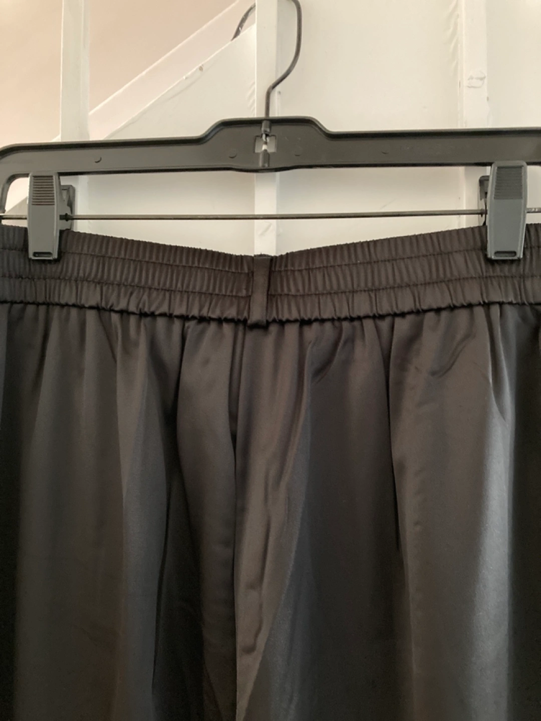 Elegant black satin trousers. Elastic waistband. Features pockets. Button closure. Excellent for formal or casual wear.