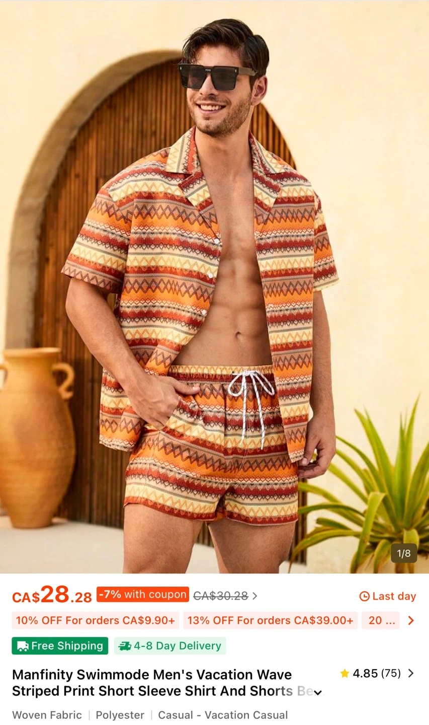 This Manfinity men's set features a short-sleeve collared shirt and matching shorts, both with a colourful striped print. It's made from woven fabric, a blend of polyester. This outfit is perfect for a beach vacation or casual summer days!