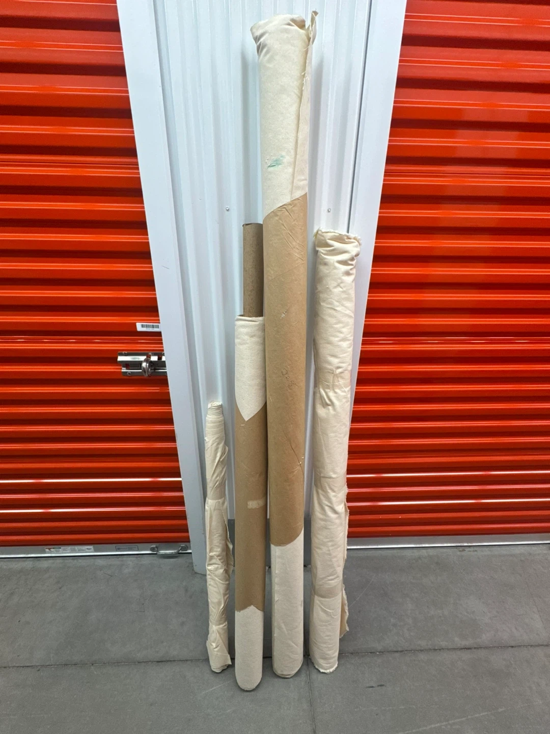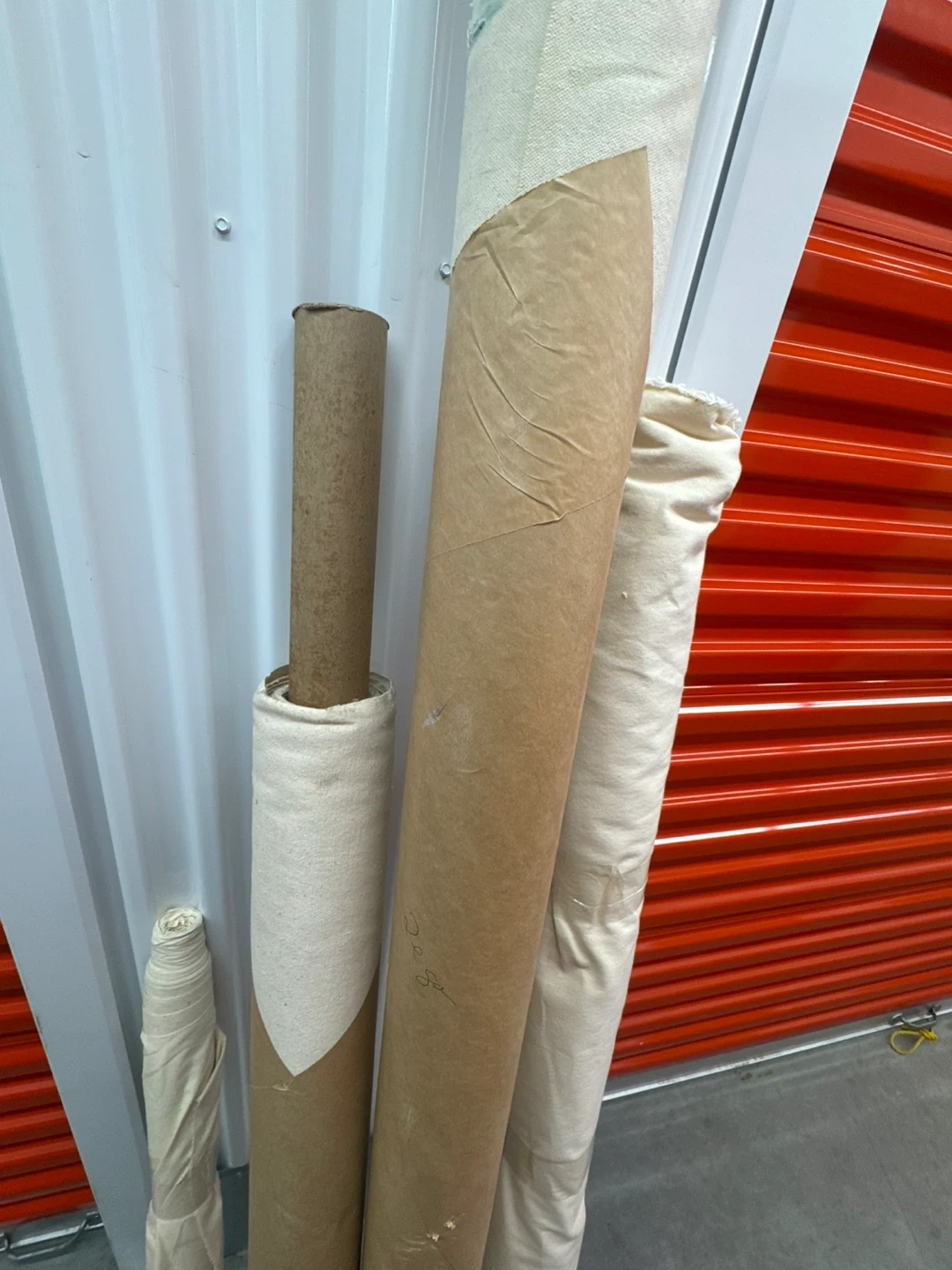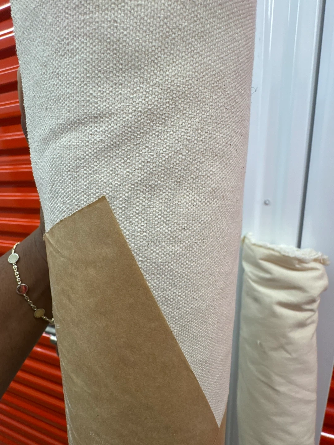 Several rolls of natural coloured canvas fabric. Unsure of exact material composition or dimensions, but it's a sturdy woven textile. Perfect for upholstery, crafting, or DIY projects!