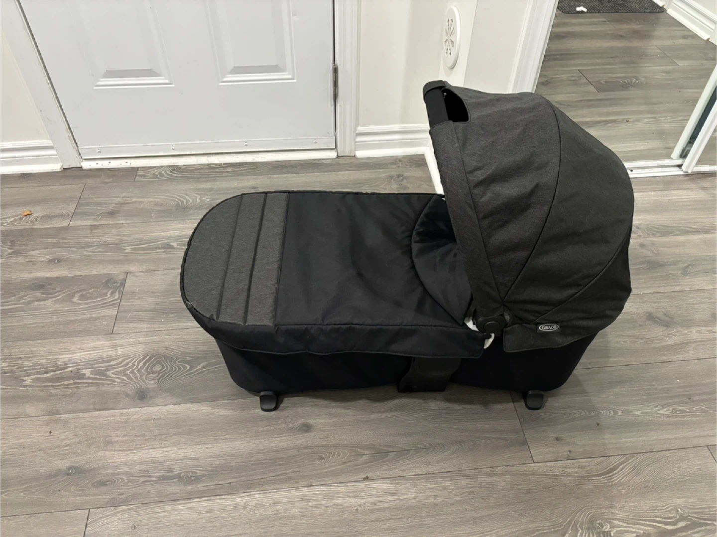 This is a Graco bassinet attachment for a stroller. It's black and grey with a white interior liner. It offers a safe place for a baby to rest while on the go.