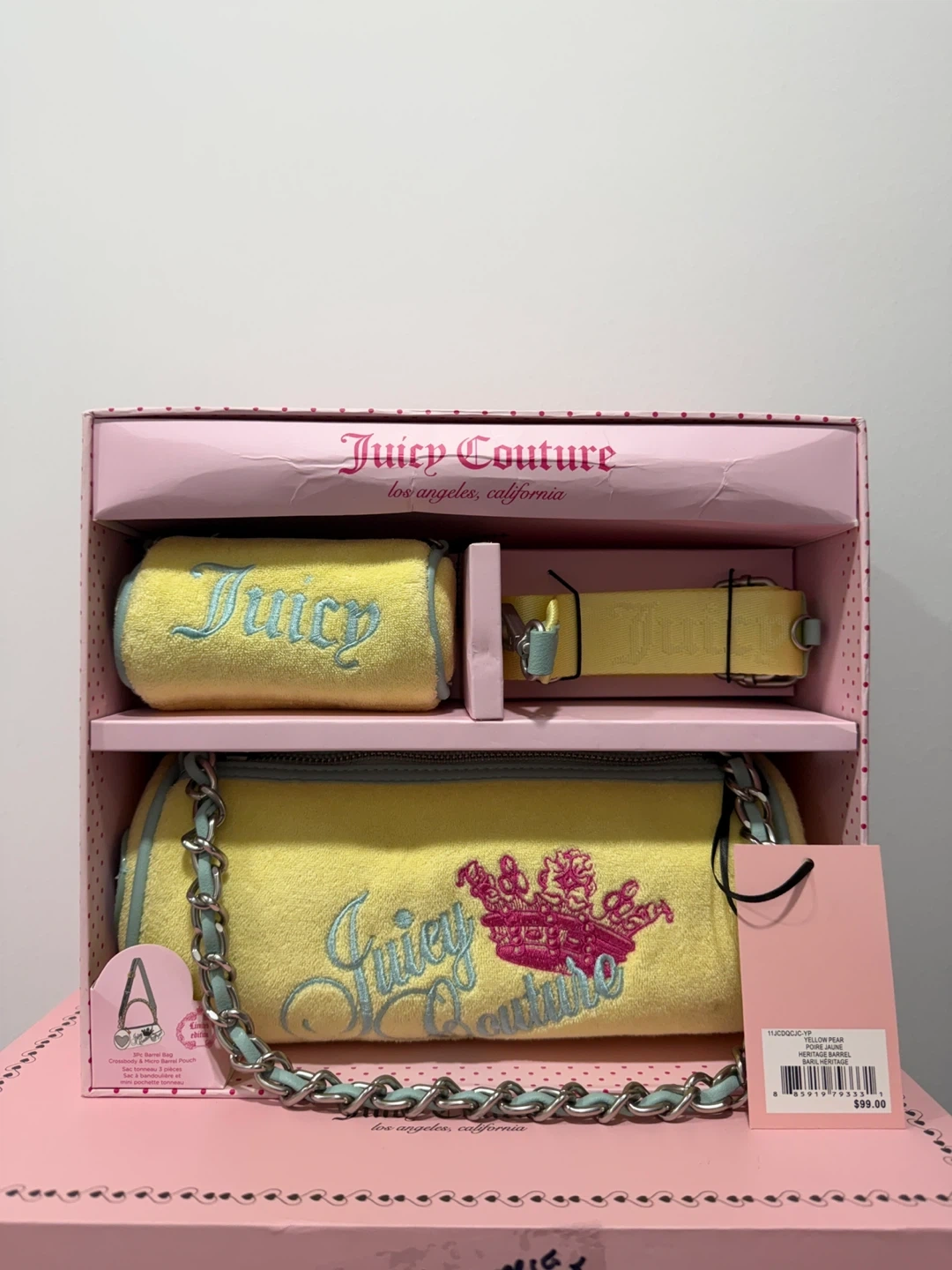 This is a brand new Juicy Couture barrel bag set in the Yellow colour! The set includes a crossbody bag and a micro barrel pouch. This heritage barrel set comes in the original box.