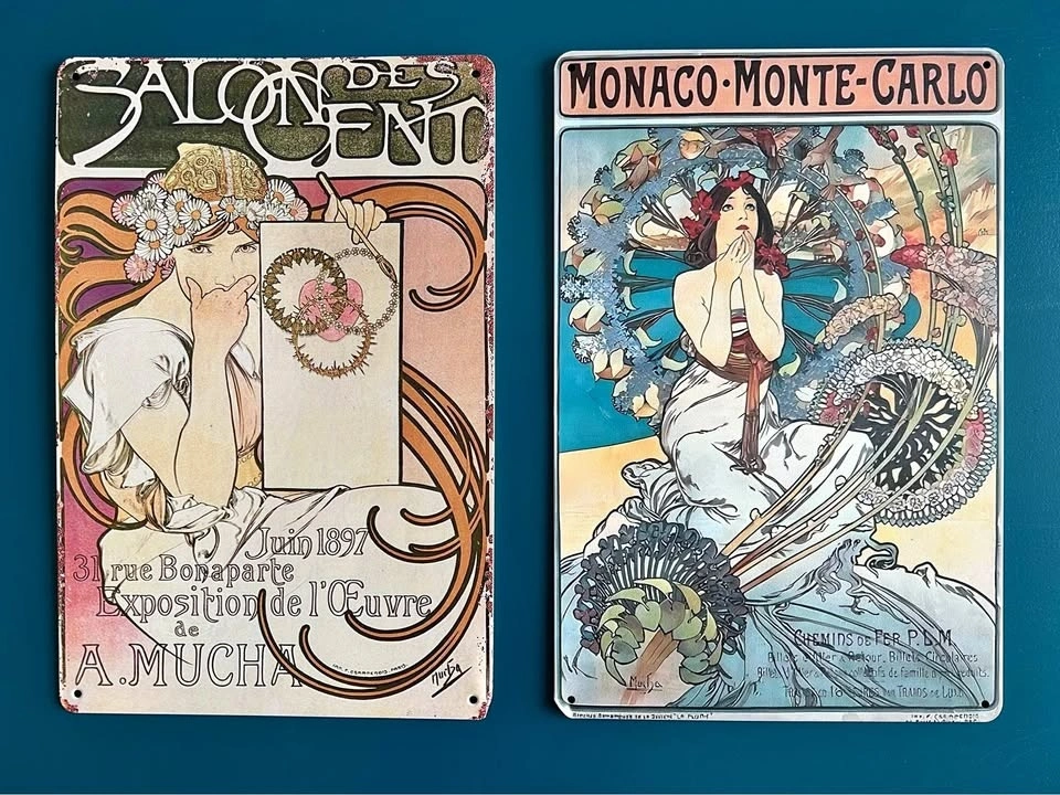 Beautiful set of two metal signs in the Art Nouveau style by Alphonse Mucha. One sign features 'Salon des Cent' and the other 'Monaco Monte-Carlo'. Both have pre-drilled holes for easy hanging. Dimensions are 7.75” x 11.75”. Pick-up near St. Vital Park from a non-smoking, 1 kitty home.