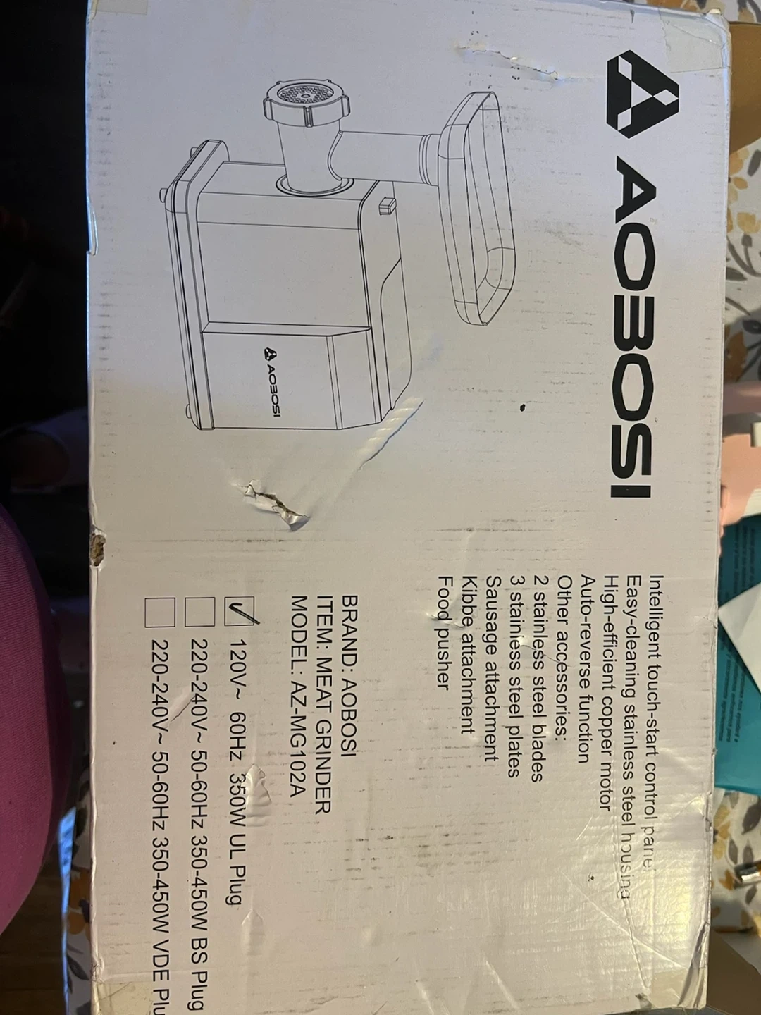 This AOBOISI meat grinder comes with a sausage and kibbe kit. It features stainless steel housing and three stainless steel blades. The kit includes a food pusher and sausage attachment.