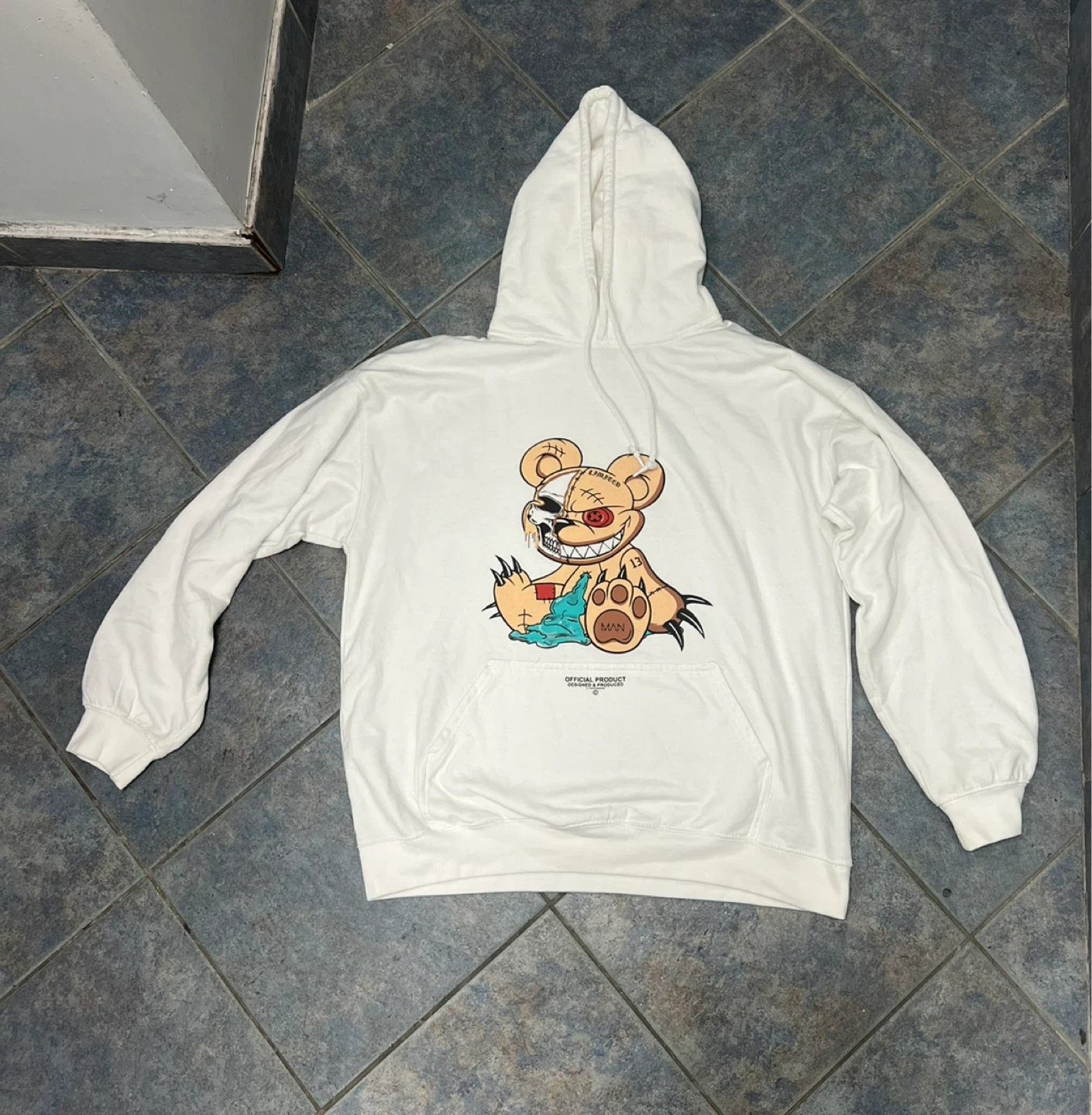 Graphic hoodie in white, size Medium.