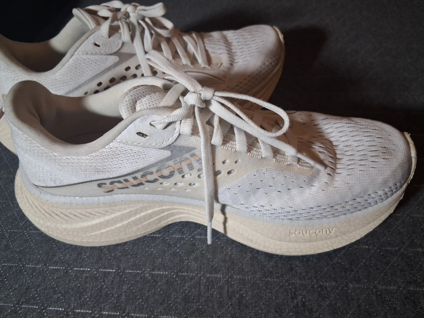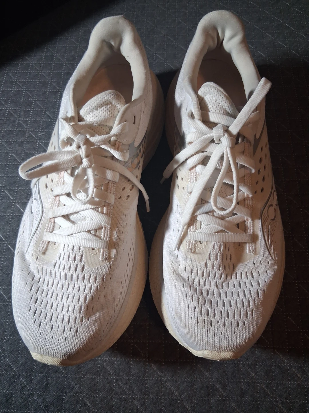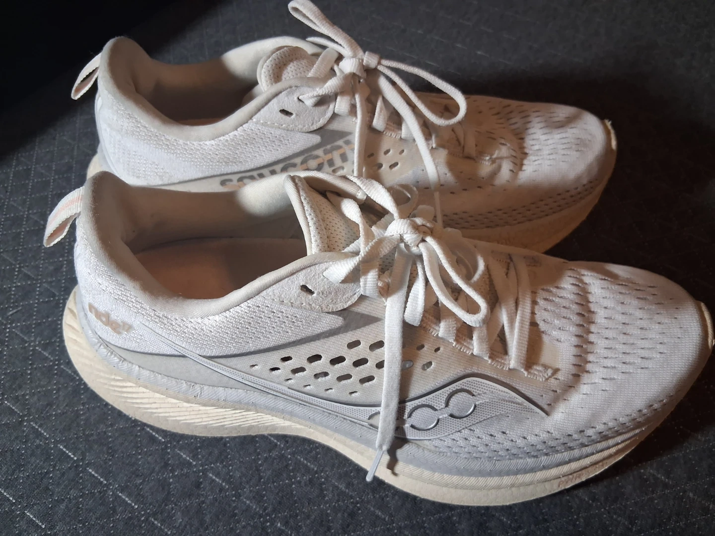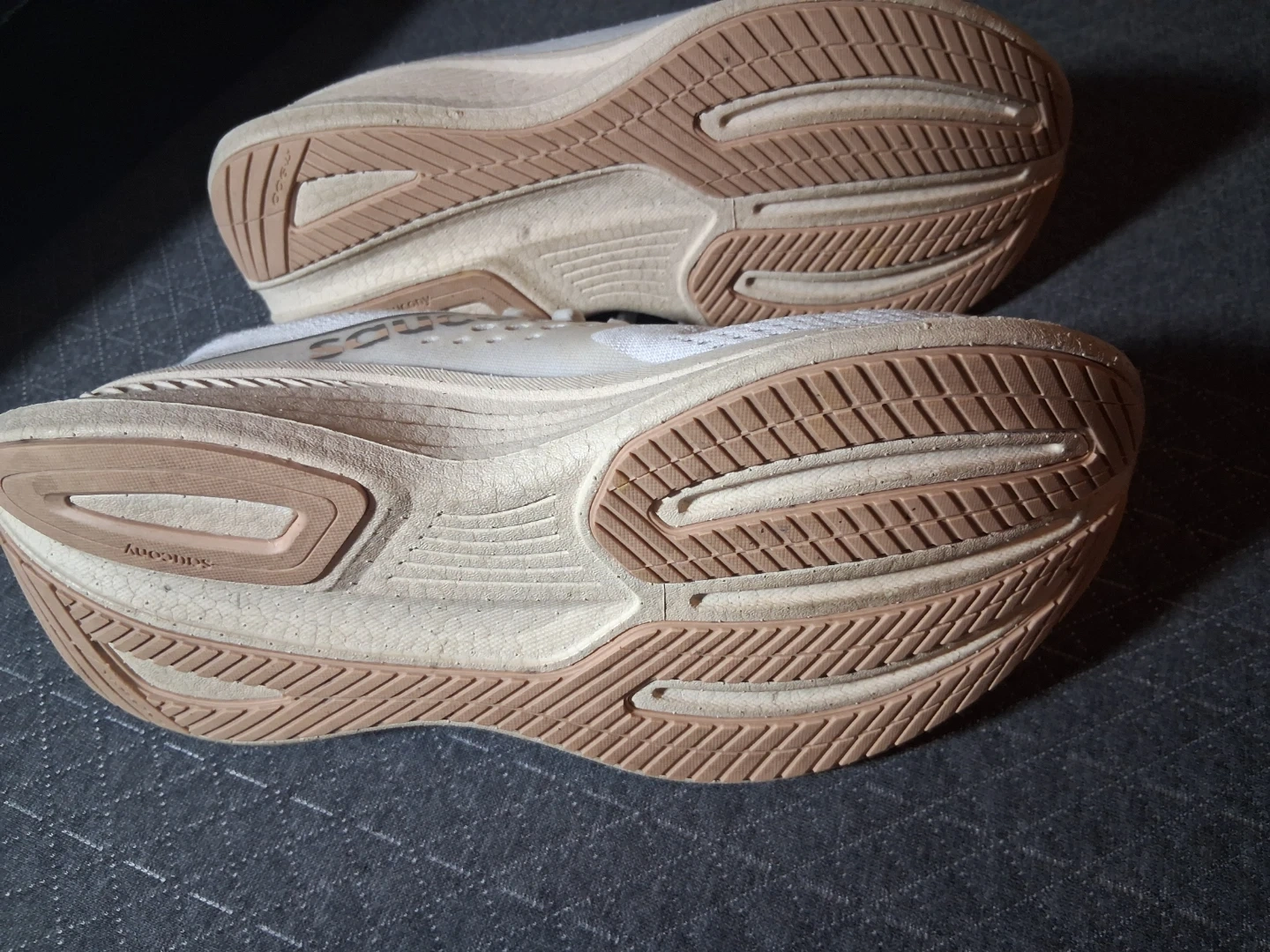 These are Saucony running shoes in white and tan. They feature a breathable mesh upper and a supportive sole. Ideal for road running!
