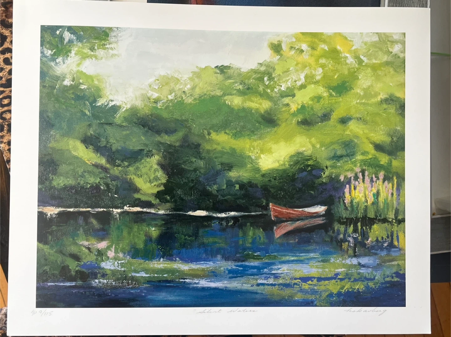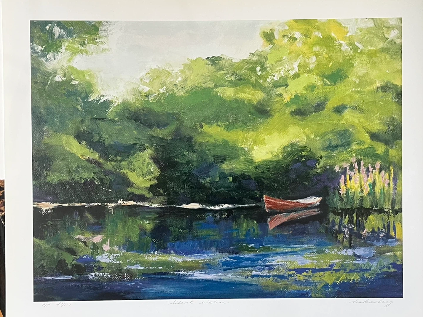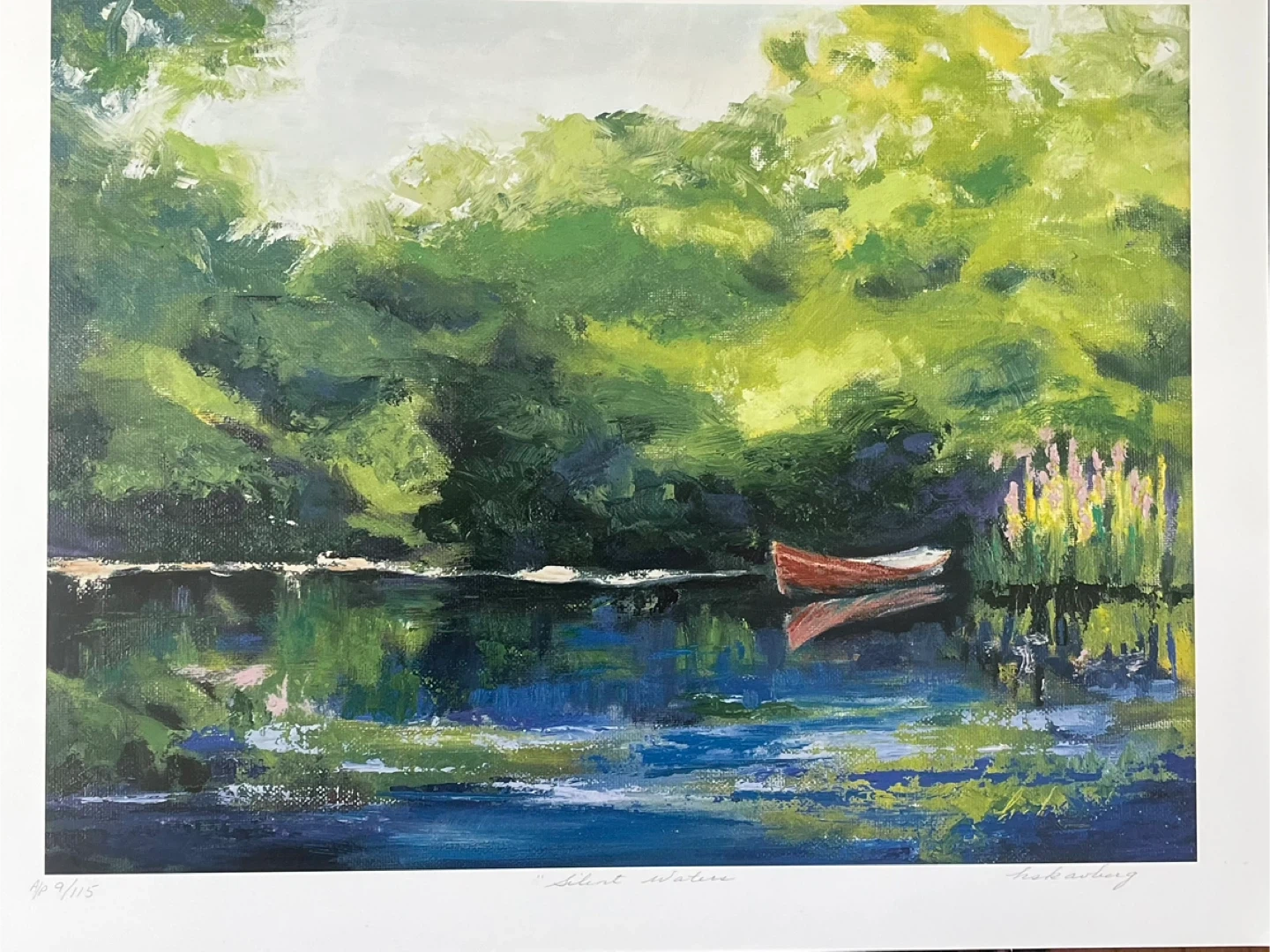 This is a print of the "Silent Waters" painting by Calgary artist Hazel Scavberg. It features a red boat on a lake surrounded by lush greenery.