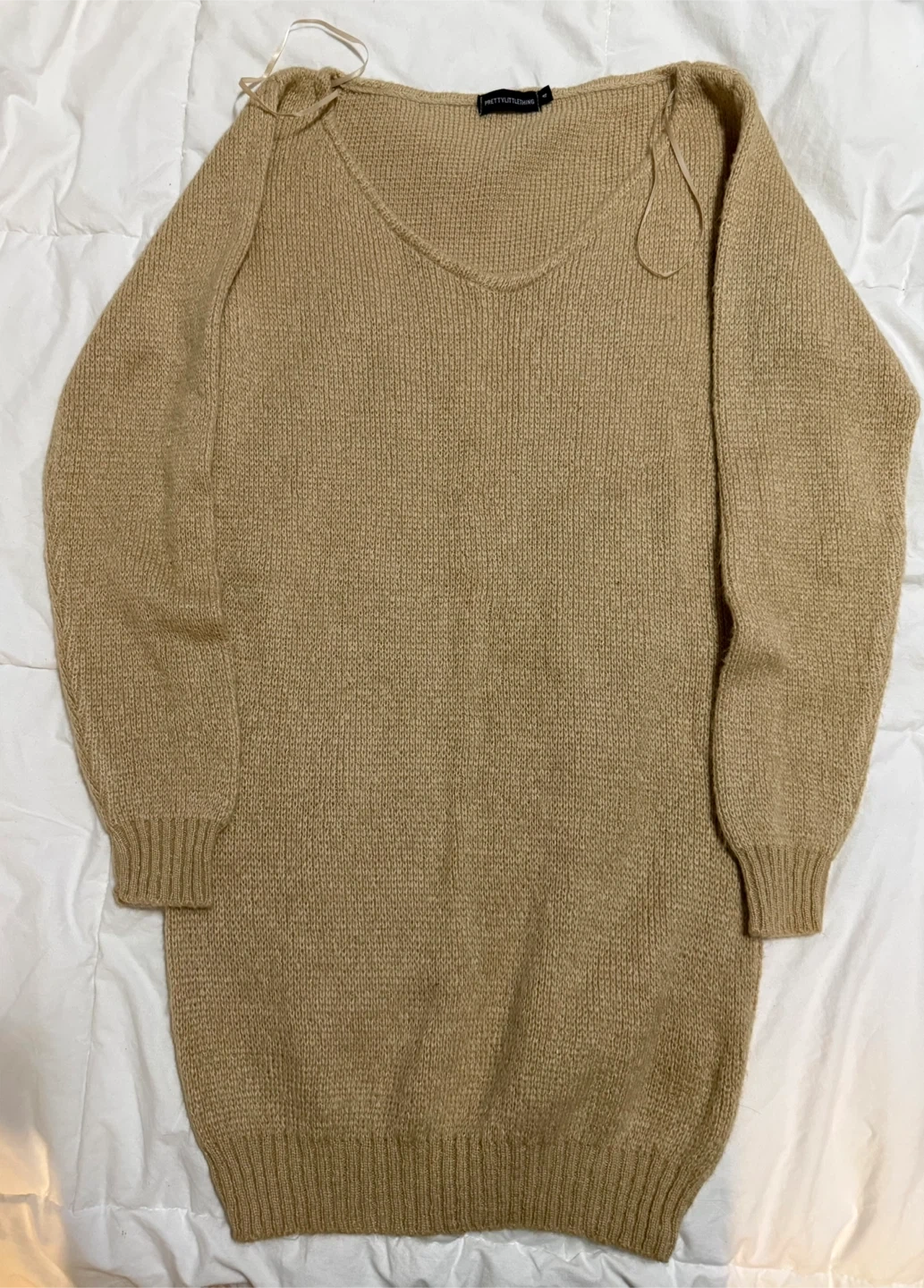 PrettyLittleThing tan knit sweater Dress. It's a size 4. The sweater has a V-neck with tie details on the shoulders. It's made from a soft knit material.