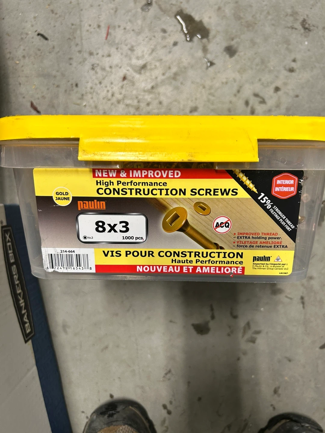 Selling a container of Paulin high-performance construction screws, size 8x3. There are 1000 pieces in the container. These screws are new and improved, designed for interior use with a stronger thread for extra holding power