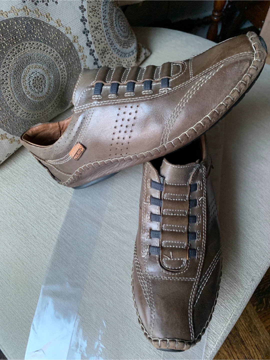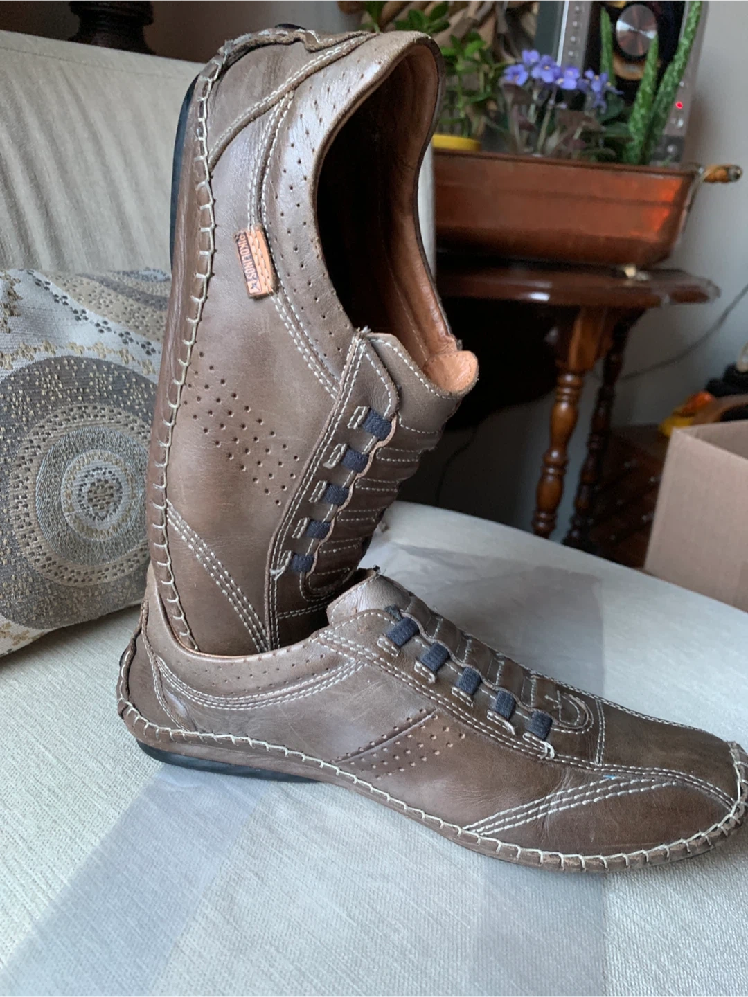These brown Pikolinos shoes are made of genuine leather. They feature a comfortable driving shoe style with classic stitching. Size 41.