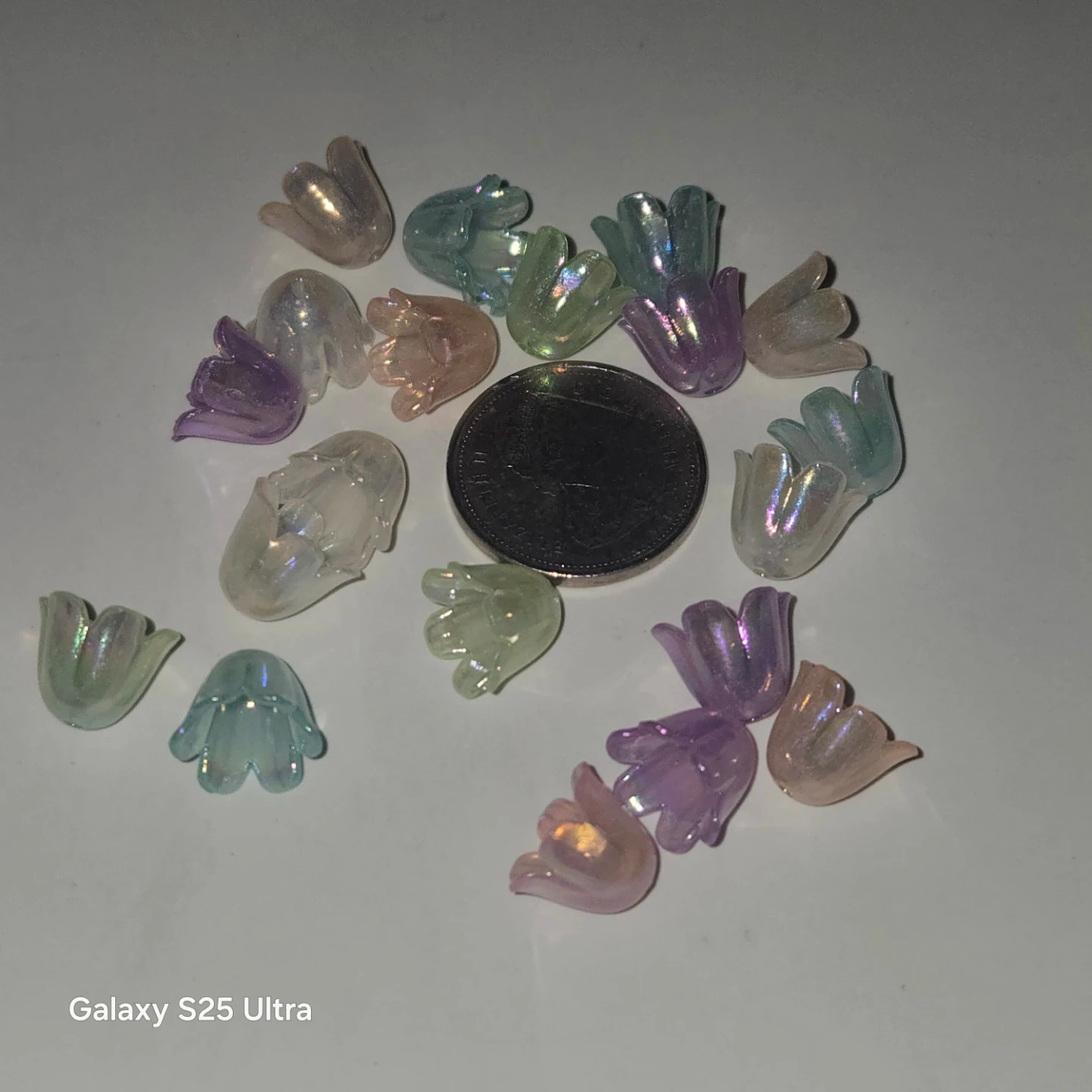 Selling a collection of iridescent flower beads! These beads have a lovely shimmer and come in a variety of pastel colours. Perfect for your next crafting project