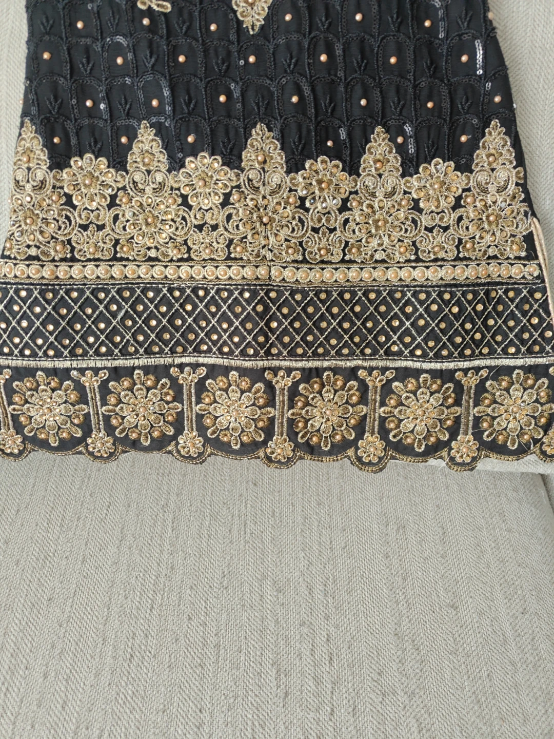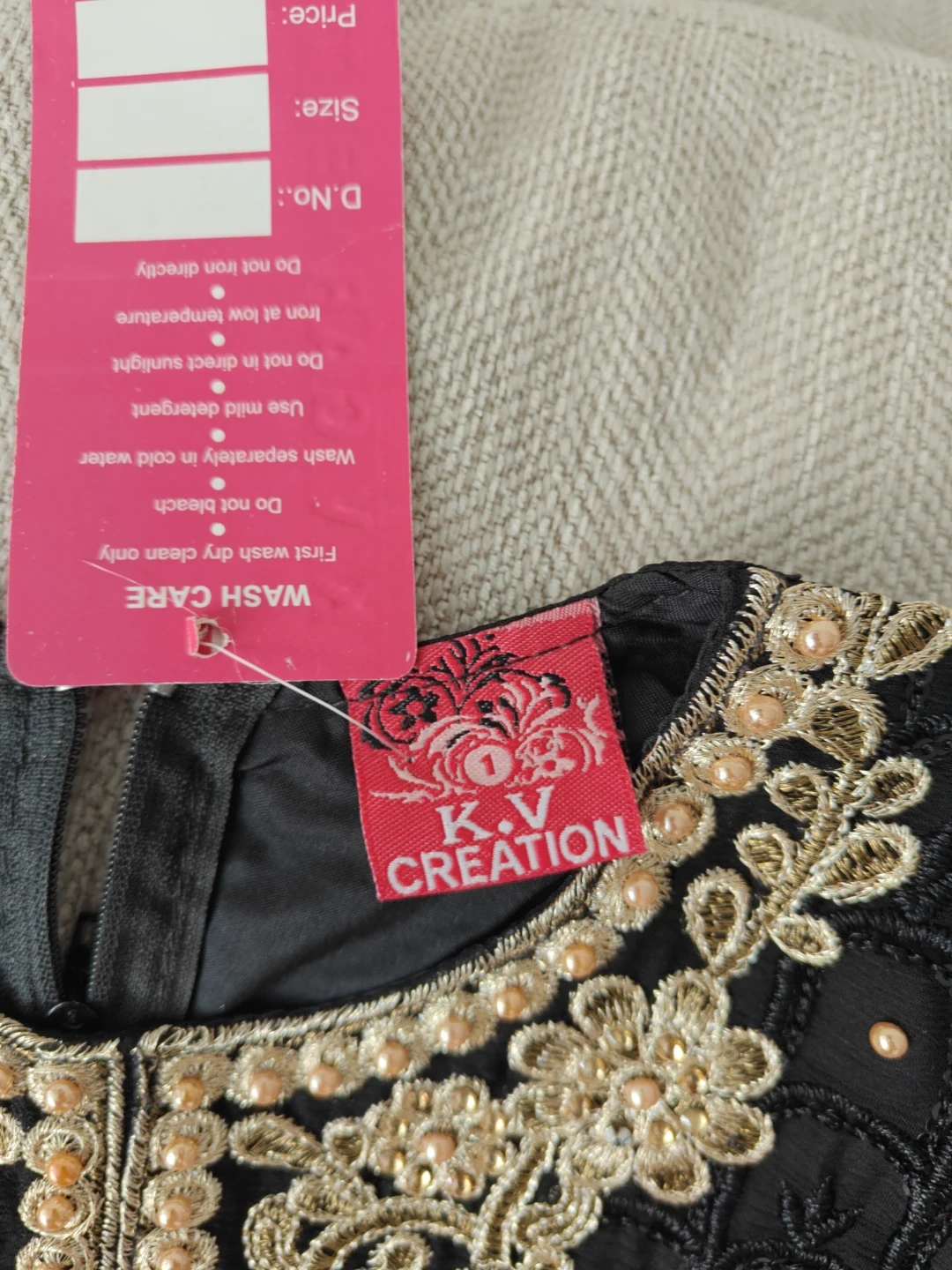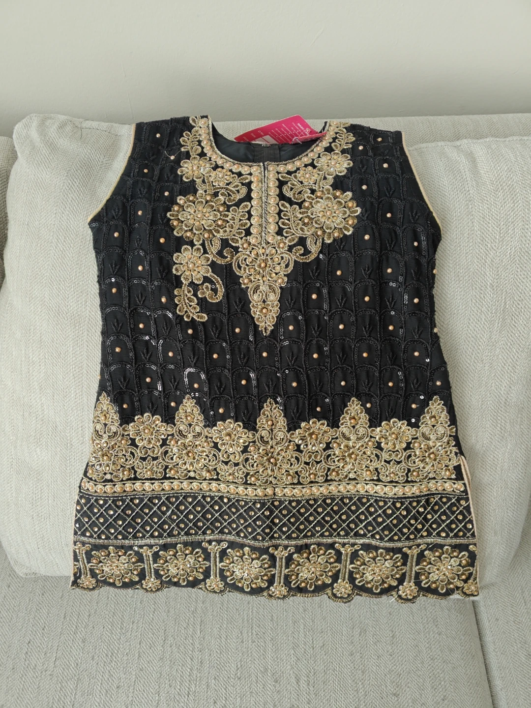 Beautiful black kurti tunic with intricate gold embroidery and beadwork. It features a zippered front and a decorative rope tie with tassels at the back. Perfect for cultural events or festive occasions!