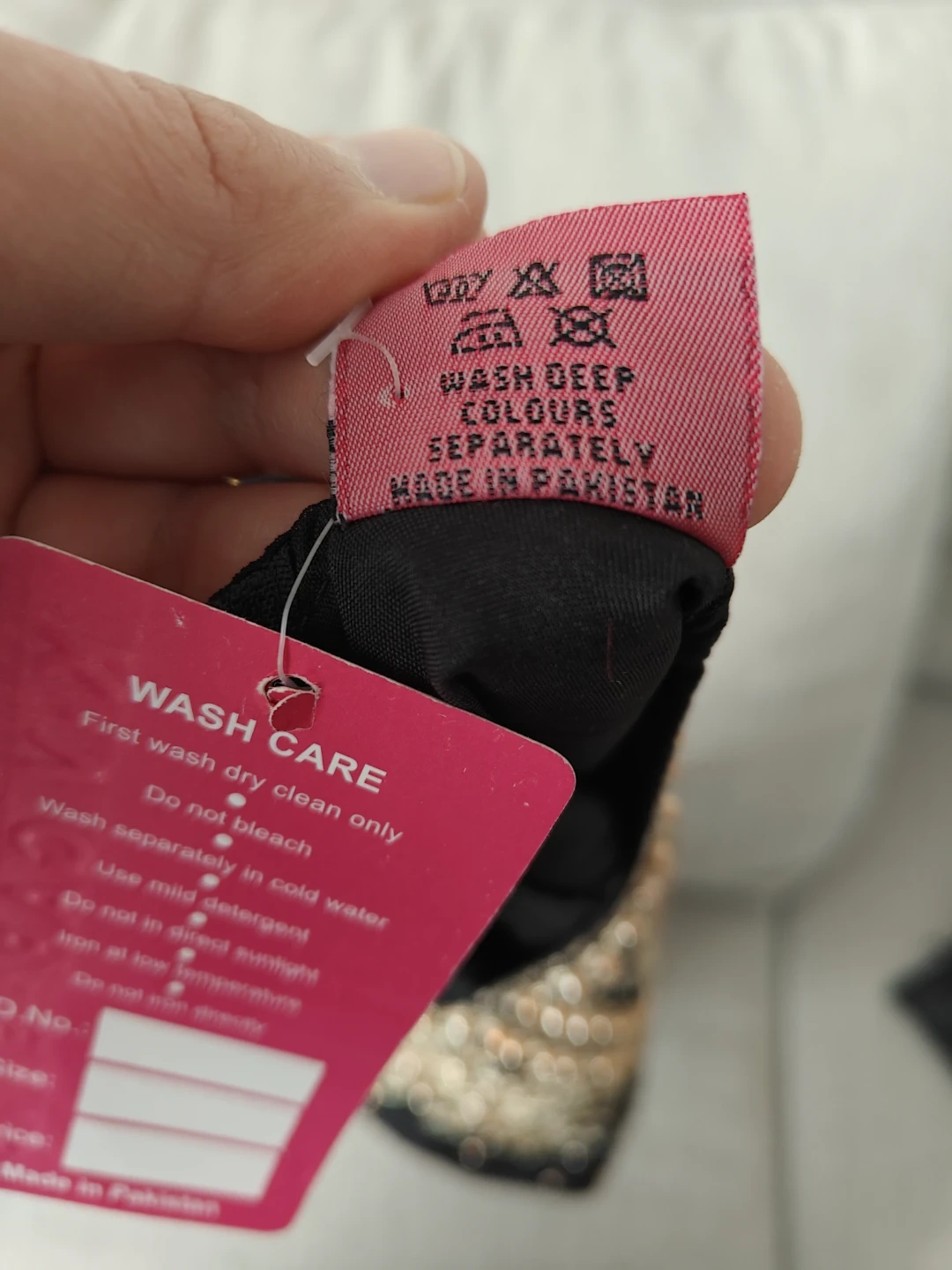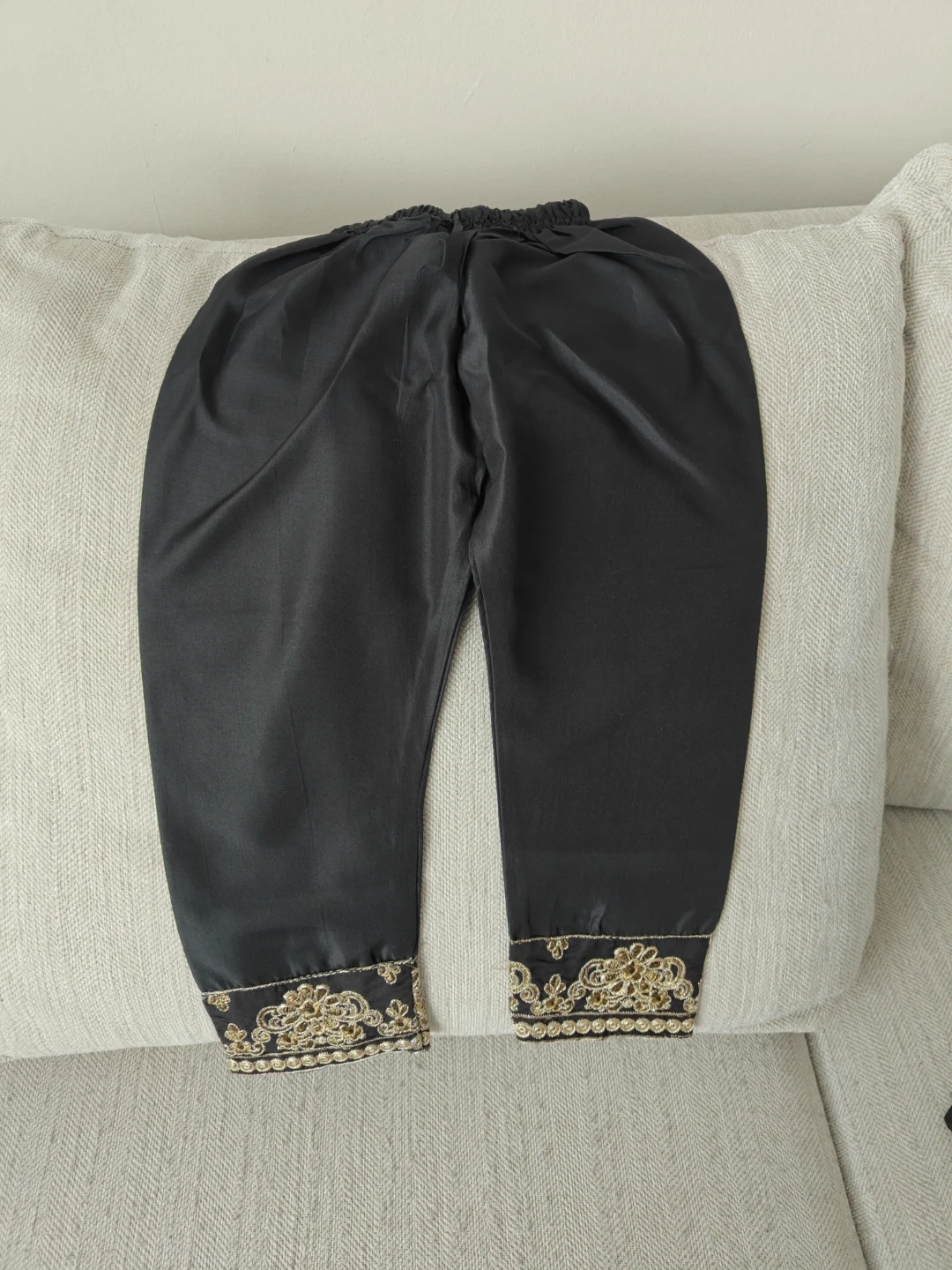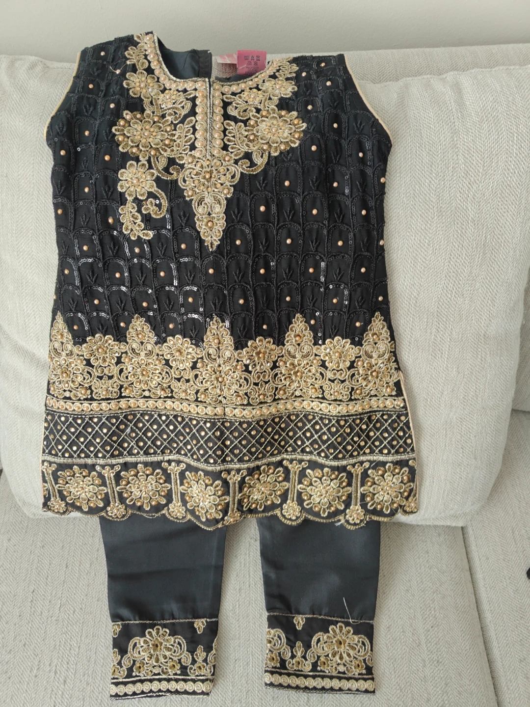 Beautiful black kurti tunic with intricate gold embroidery and beadwork. It features a zippered front and a decorative rope tie with tassels at the back. Perfect for cultural events or festive occasions!