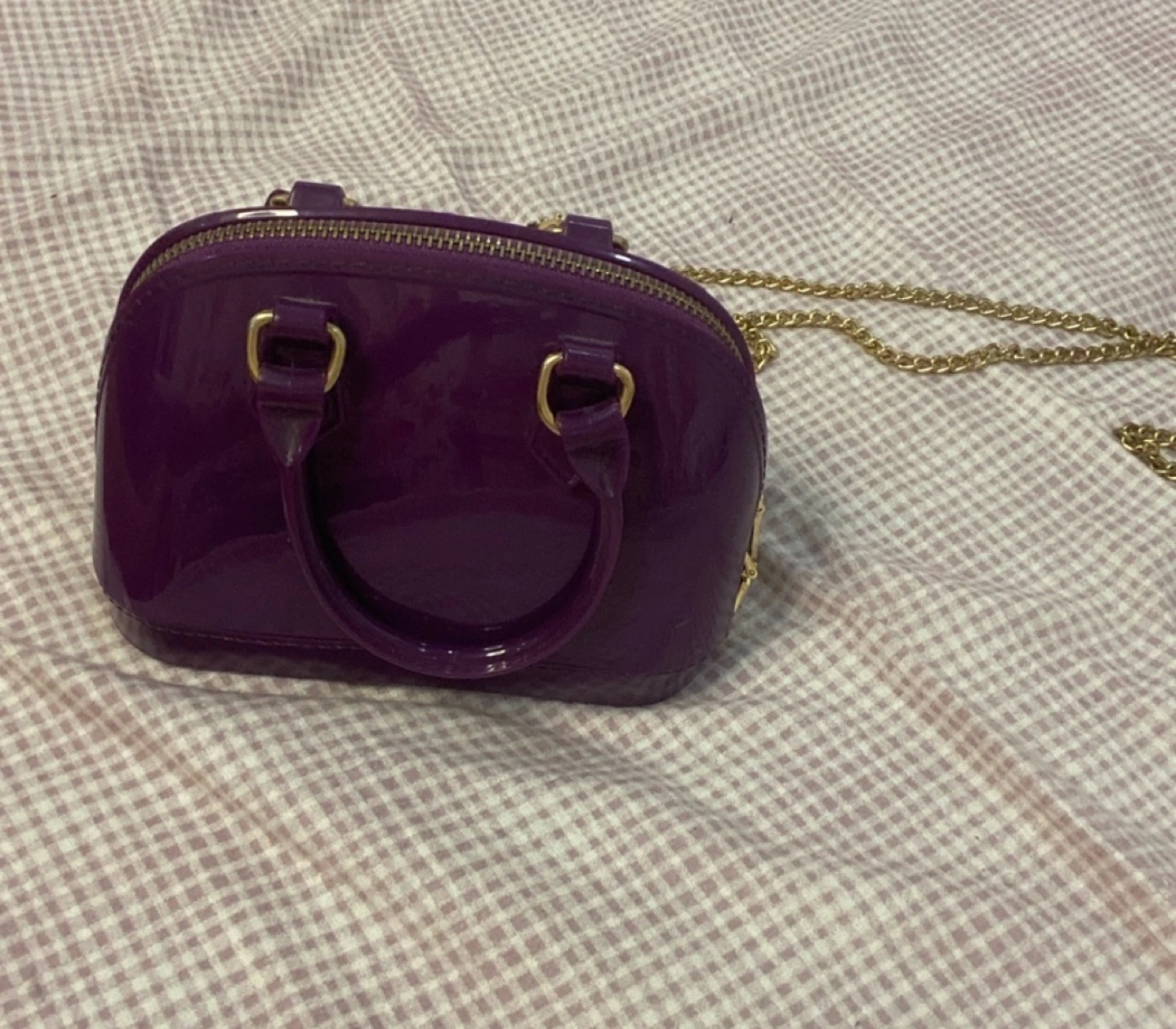 Adorable mini handbag. Shiny purple jelly material. Gold-toned chain strap and hardware. Top zip closure. Small, perfect for essentials.