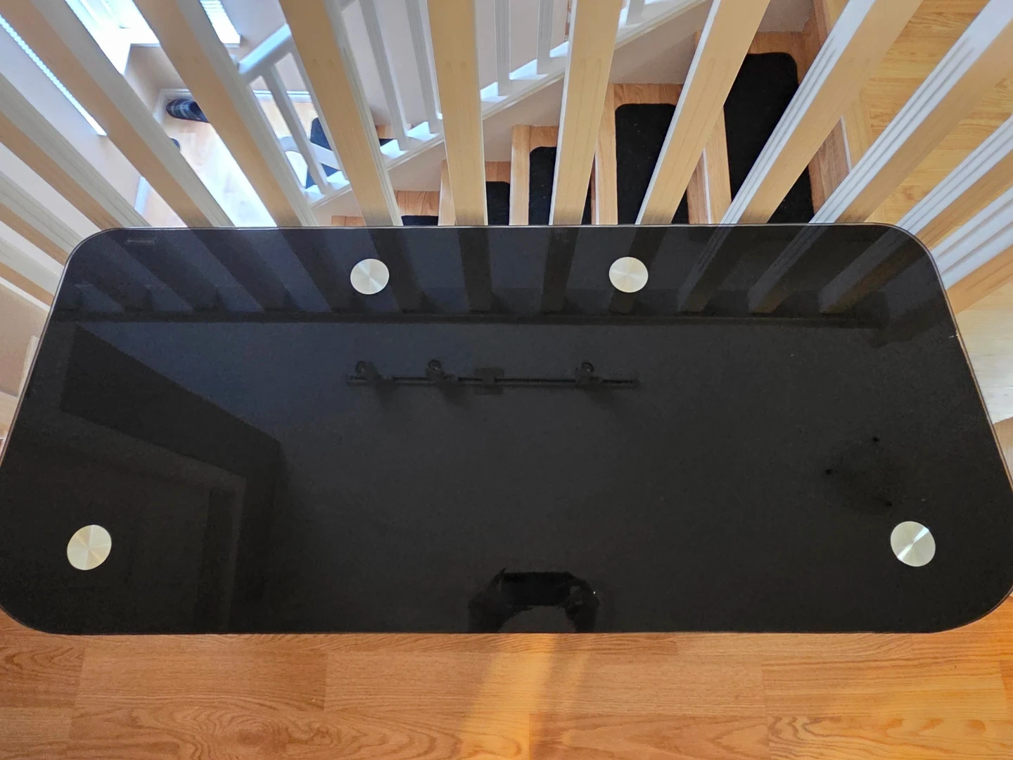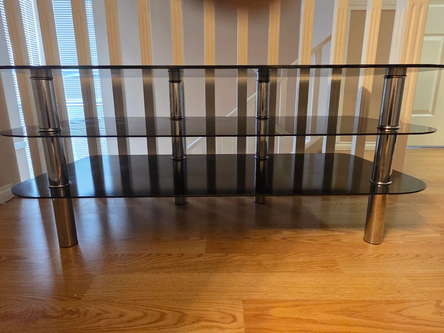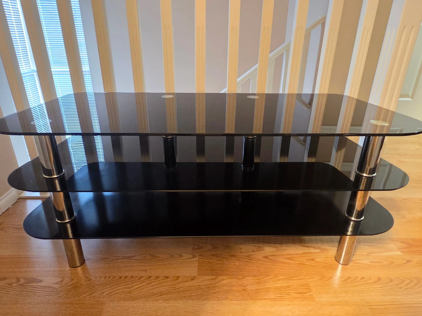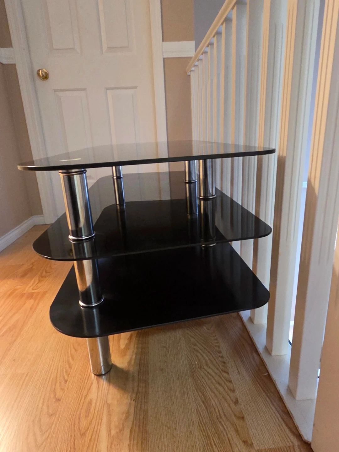 Selling a sleek black glass TV stand with chrome legs. It has three tiers, perfect for storing your media devices and accessories. It's in great condition and ready to enhance your living room setup.