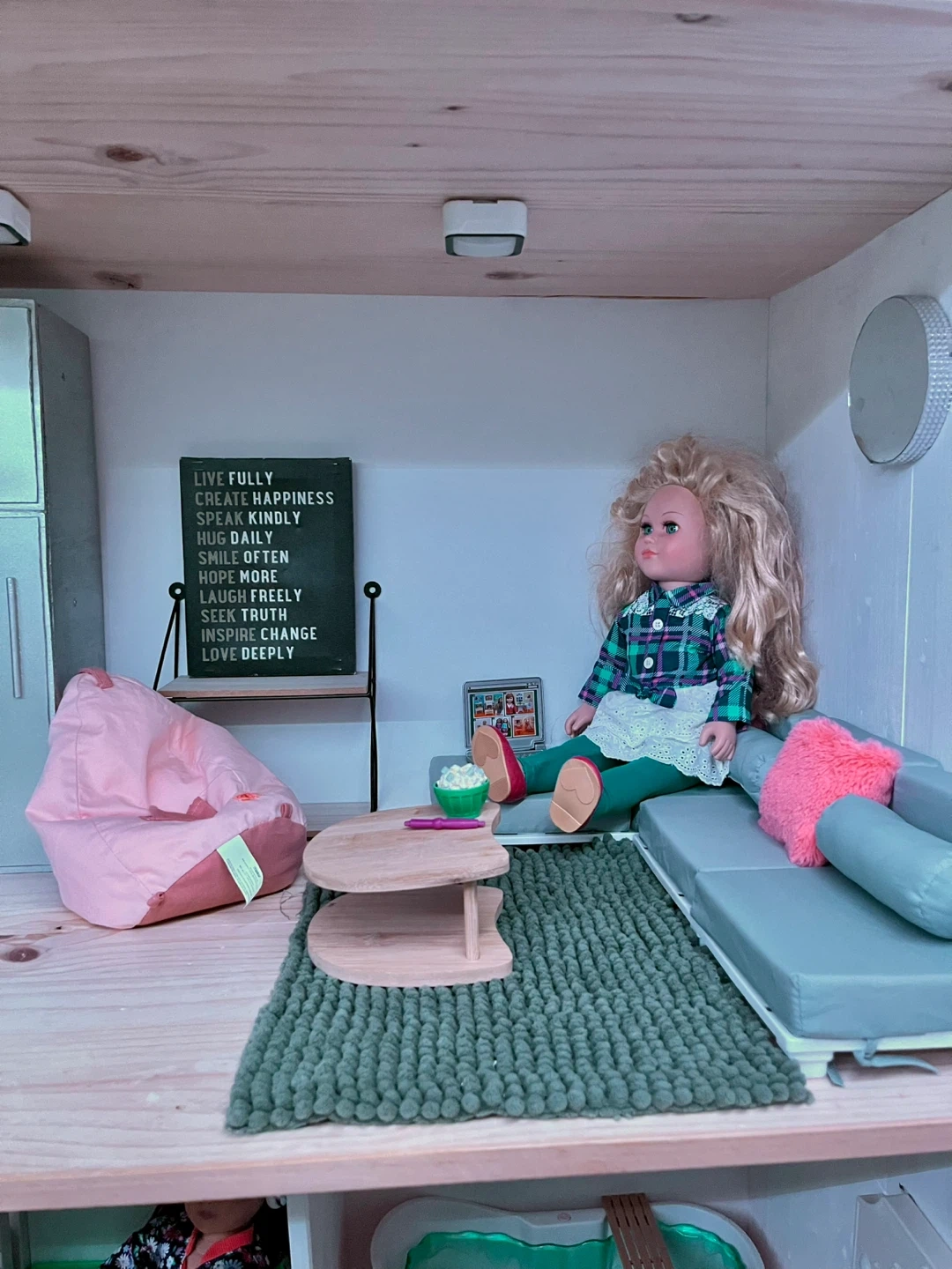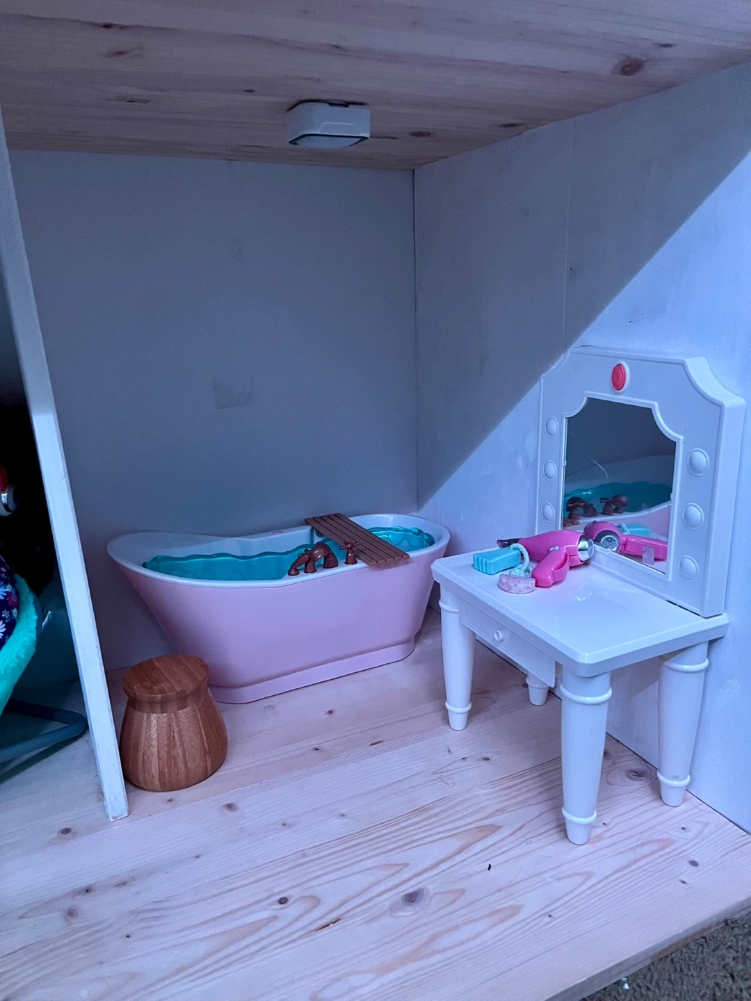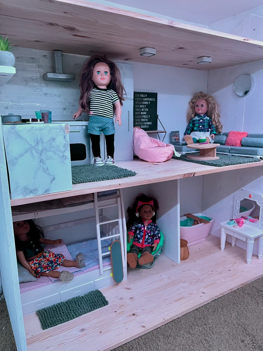 This is a spacious wooden dollhouse, perfect for hours of imaginative play. It includes four 18” dolls and various miniature accessories for a complete setup. Including car, extra clothes and shoes, all furniture and accessories shown in the photos.