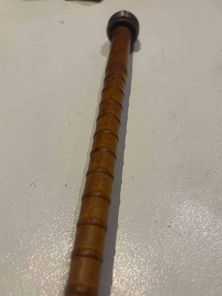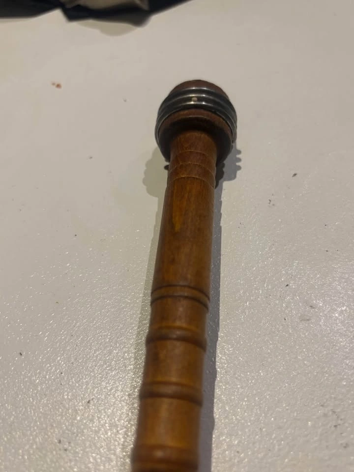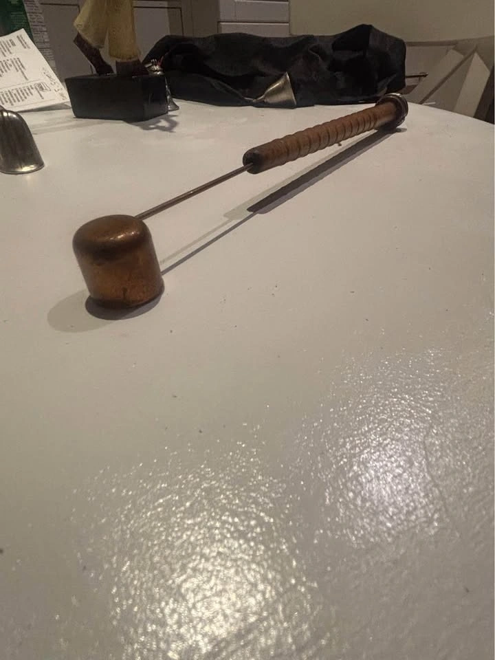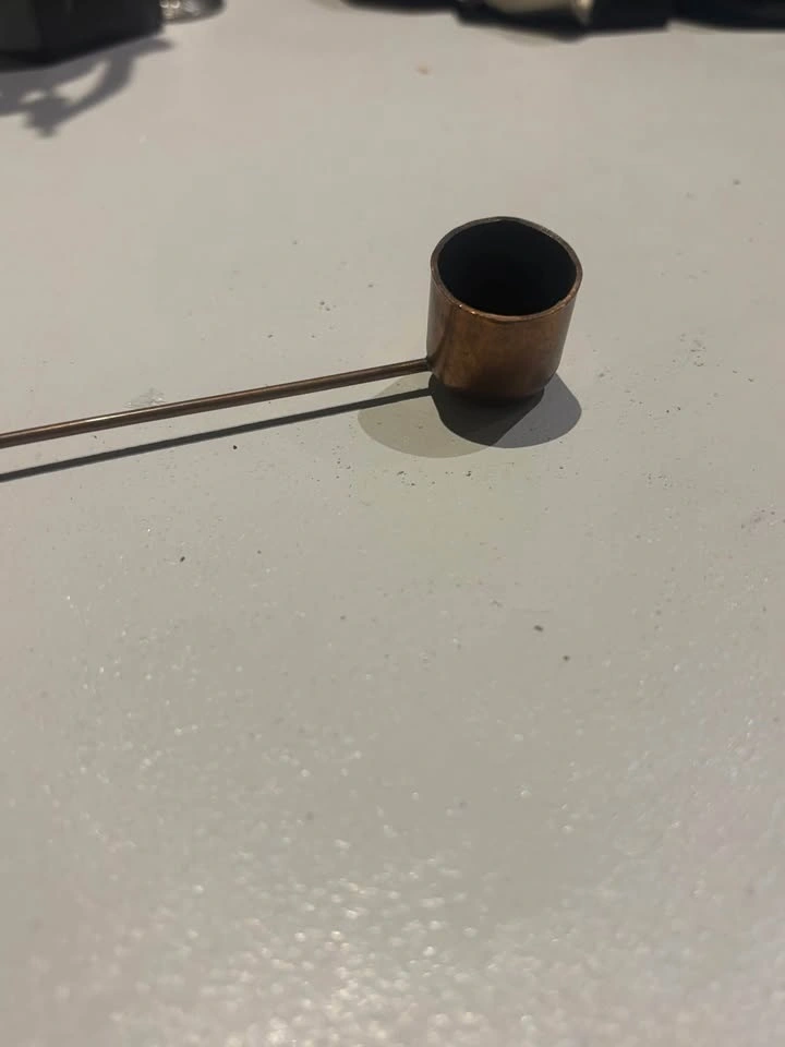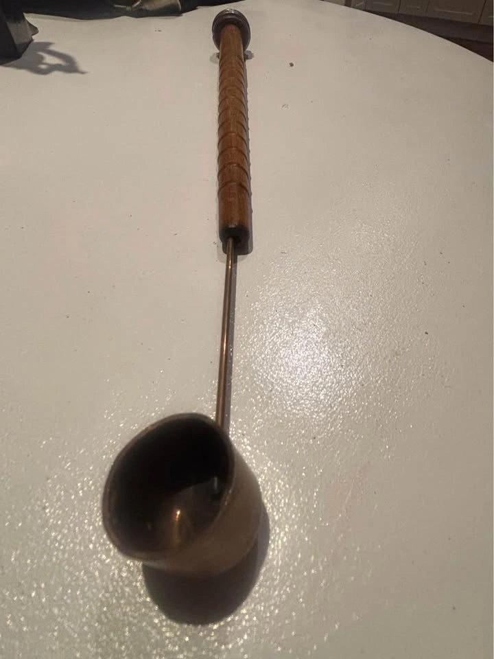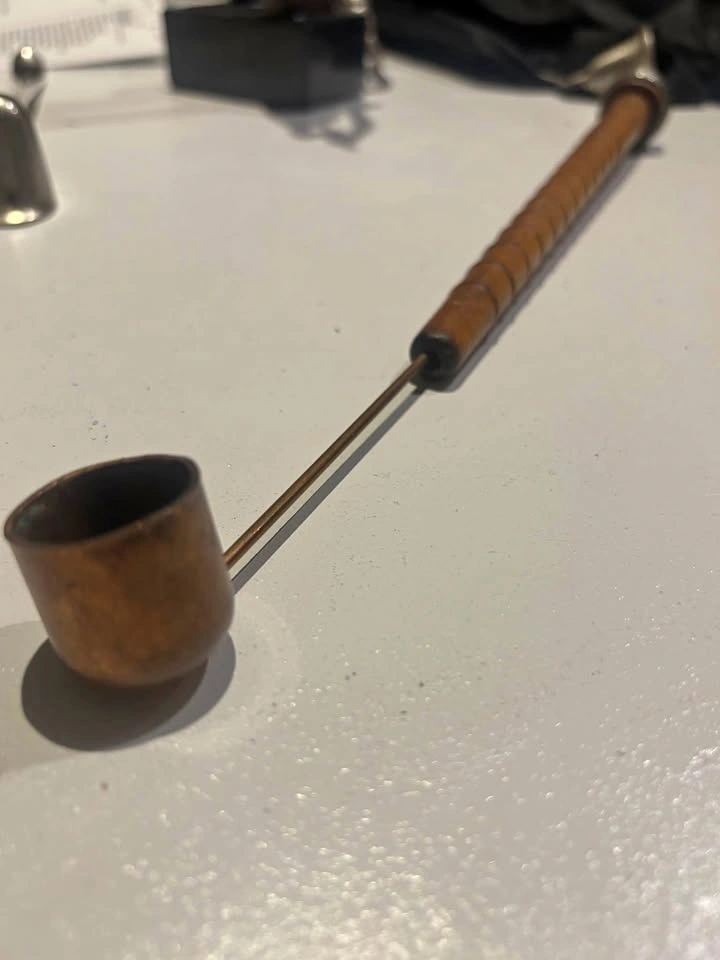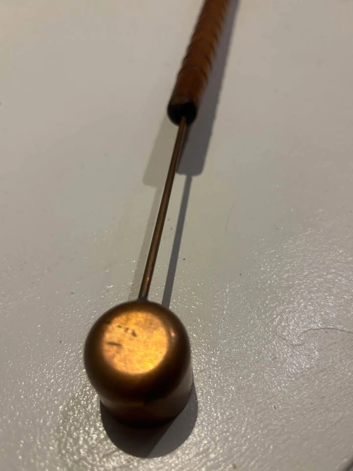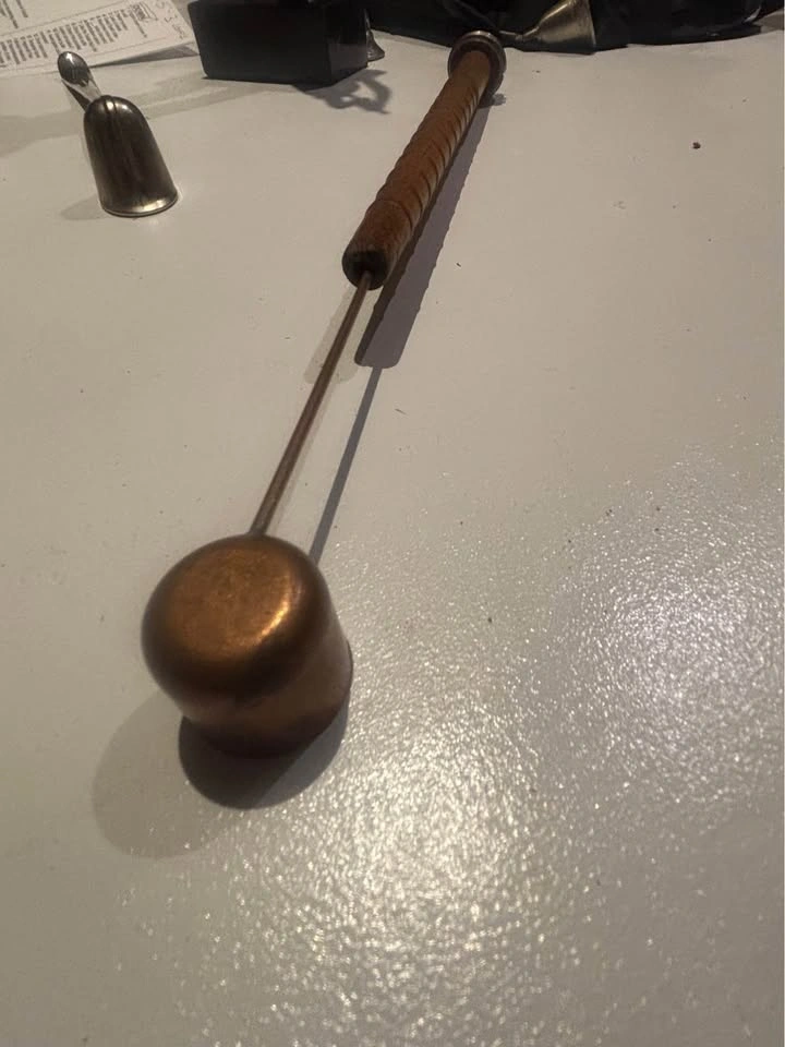 Vintage 1960s copper cone, wooden sewing spool handle candle snuffer. Length: 15 3/8 inches, Width: 1.25 inches, Weight: 79 grams. Let me know if you're interested!