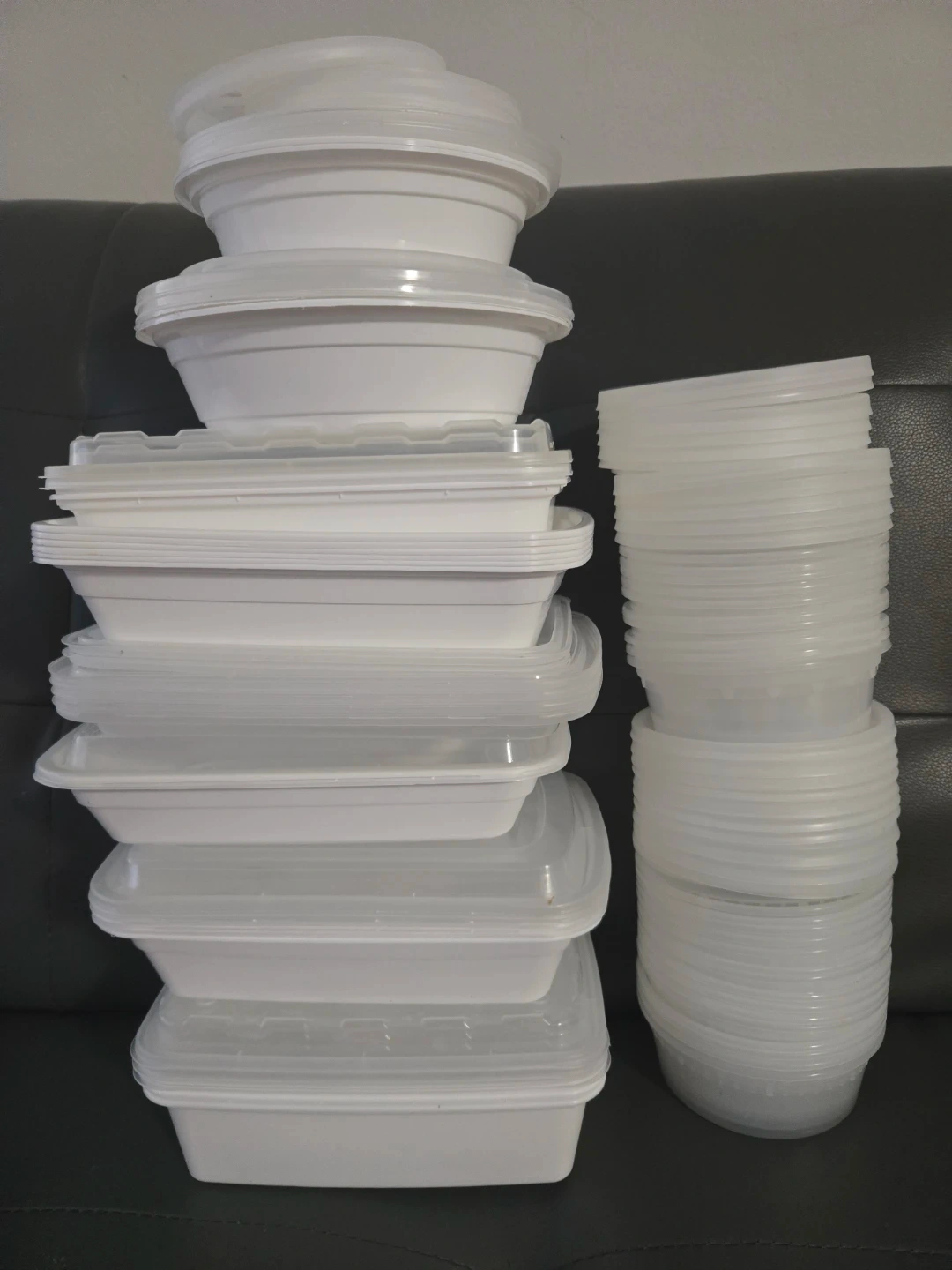 Selling a bulk assortment of white plastic takeout containers with matching lids. Great for meal prep or leftovers. Includes various sizes for different needs.