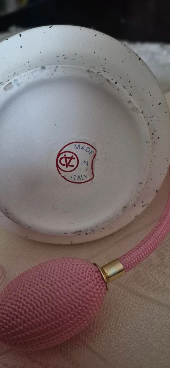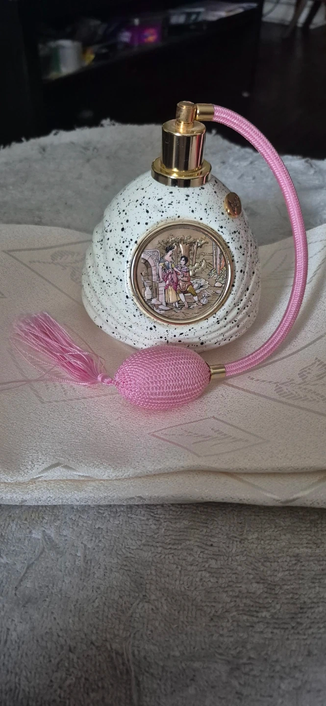 Selling a vintage Berger perfume bottle Atomizer, Made in Italy". It has a unique speckled design with a pink atomizer, gold tone and a small oval portrait on the front. It's a beautiful piece for any collector! Open to Offers!