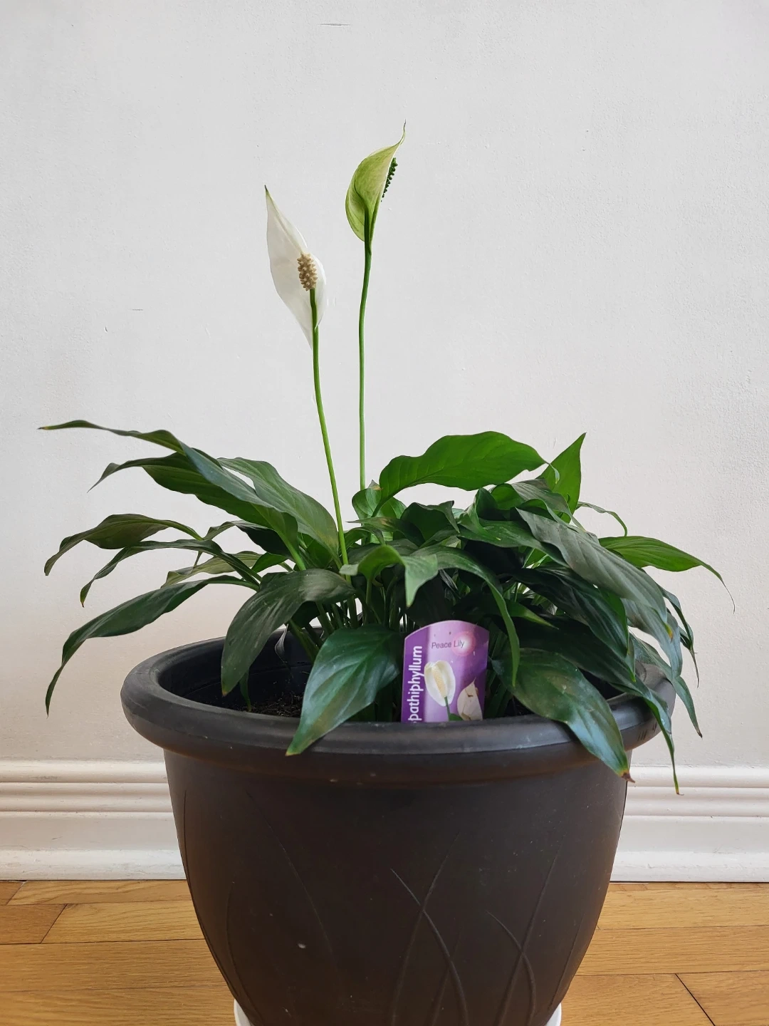 Peace Lily plant in a black pot. It's known for its elegant white flowers and lush green foliage. This plant is great for adding a touch of nature to indoor spaces. It prefers low to medium light conditions.