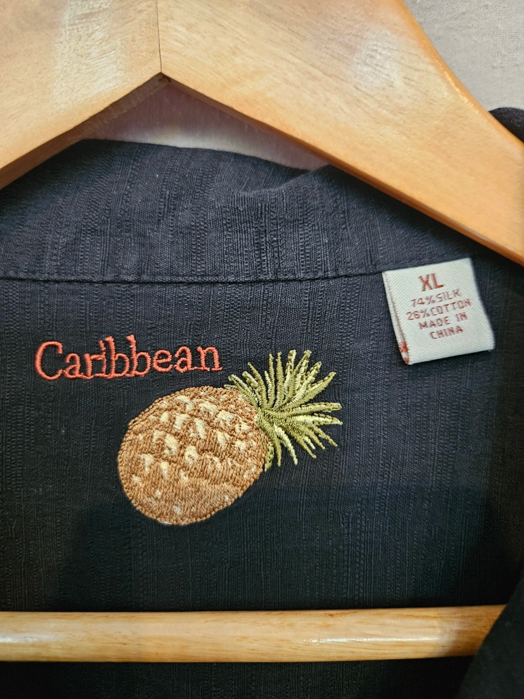 This is a black short-sleeve Caribbean shirt with a pineapple embroidery detail. It's a size XL, made of 75% silk and 25% cotton. Machine wash cold gentle cycle with similar colors.