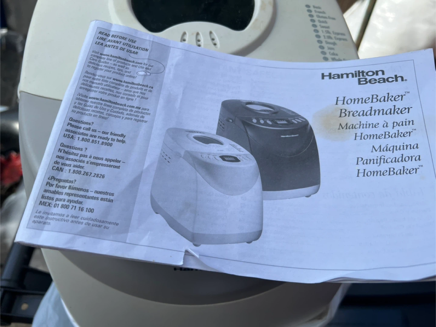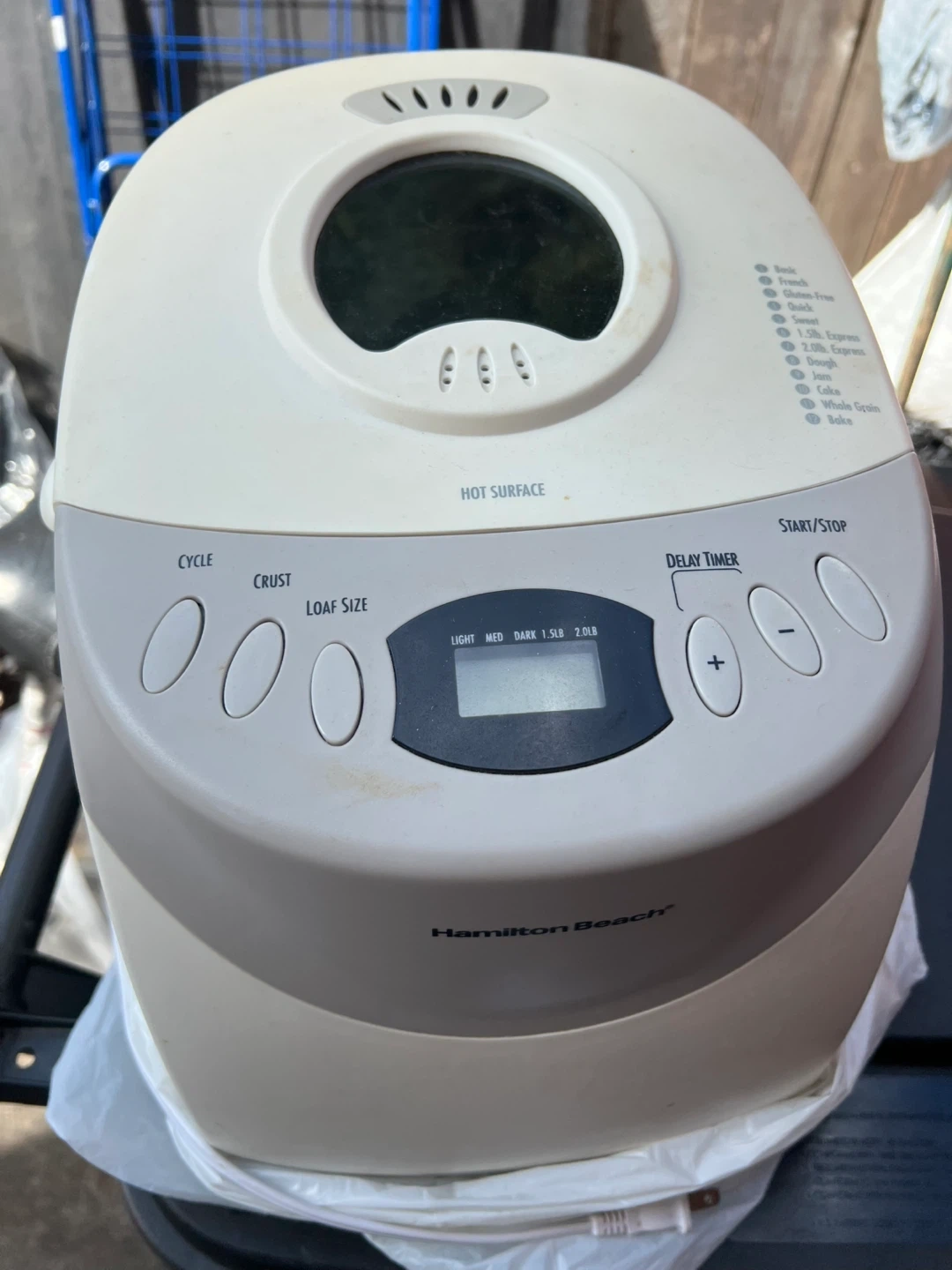 This is a Hamilton Beach HomeBaker breadmaker. It has settings for cycle, crust, and loaf size. The display shows options for light, medium, dark, 1.0lb, 1.5lb, and 2.0lb loaf sizes.