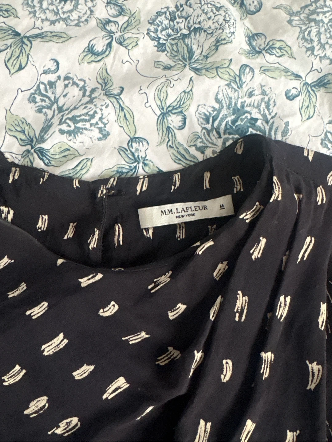 A chic sleeveless top from MM. La Fleur in black with a subtle cream dash pattern. It's a size medium. The fabric drapes nicely, making it a versatile, sophisticated piece.