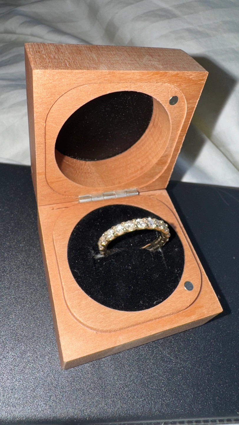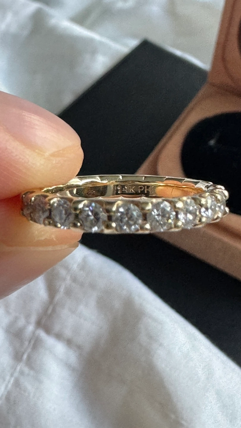 Beautiful 14K gold eternity band. Features channel-set diamonds. Comes in original wooden box.