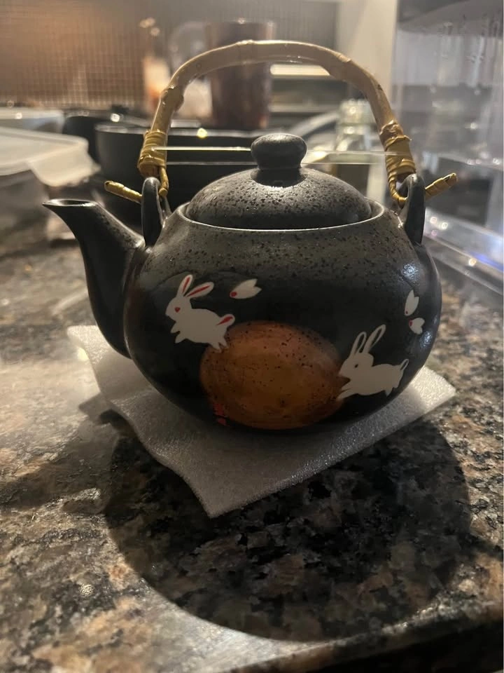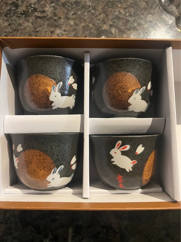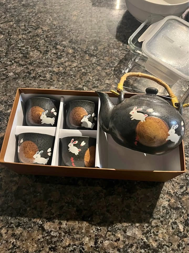 Beautiful Japanese-style ceramic tea set. Teapot with bamboo handle and 4 matching tea cups. Features a charming rabbit and moon design. Brand new, never used, and comes in its original box. Perfect for tea lovers or as a gift.