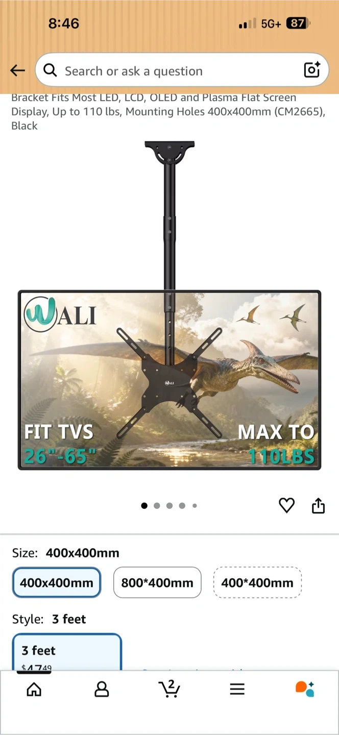 This WALI TV ceiling mount is designed for most LED, LCD, OLED, and Plasma flat screen displays between 26" and 65". It supports a maximum weight of 110 lbs and features 400x400mm mounting holes. The mount is adjustable to a height of 3 feet. It's great for mounting a TV from the ceiling in various settings.