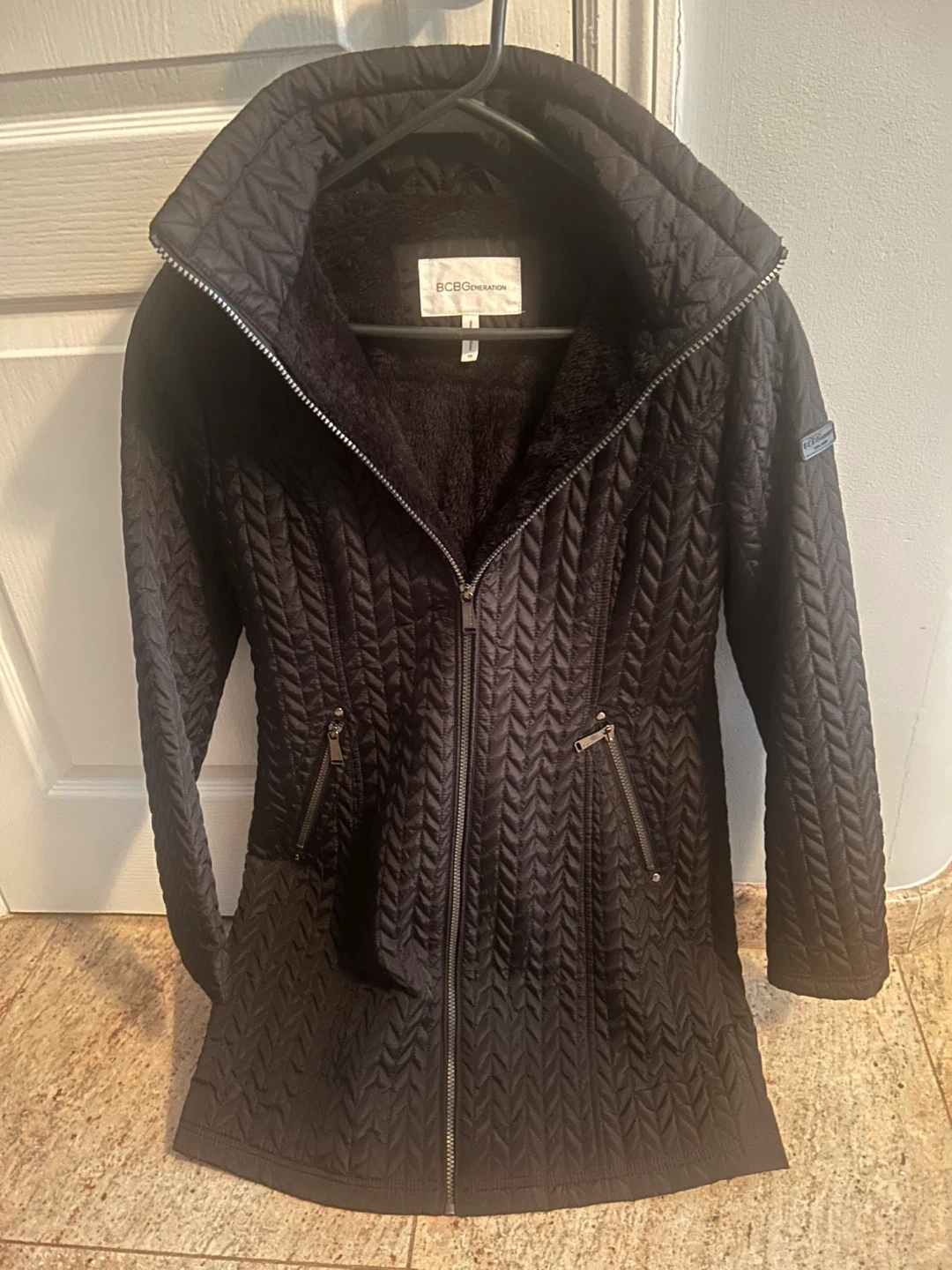 This BCBGMAXAZRIA jacket features a quilted exterior and a cozy faux fur lining. It has a full zip front and zippered pockets. The stylish cable-knit stitching adds a unique texture. It's perfect for staying warm during cooler weather!