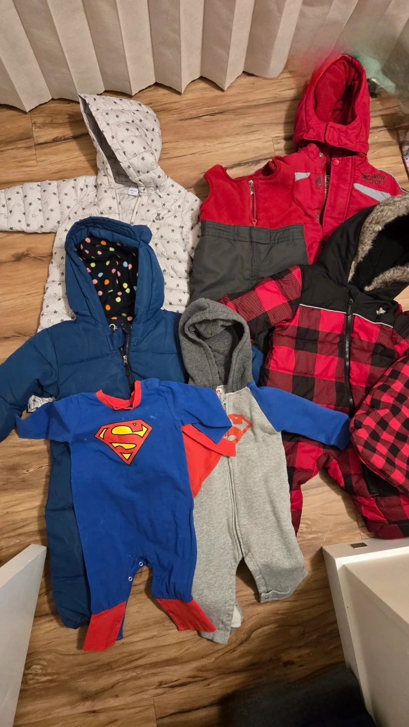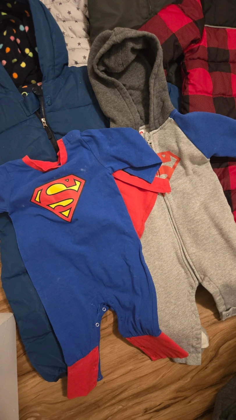 Includes a grey star print snowsuit, a red buffalo plaid snowsuit with fur-lined hood, a blue puffer jacket, a red and grey snow pant set with a zip-up vest, a blue Superman onesie with cape, and a grey Superman zipper sleeper. Great for keeping little ones warm and cozy!