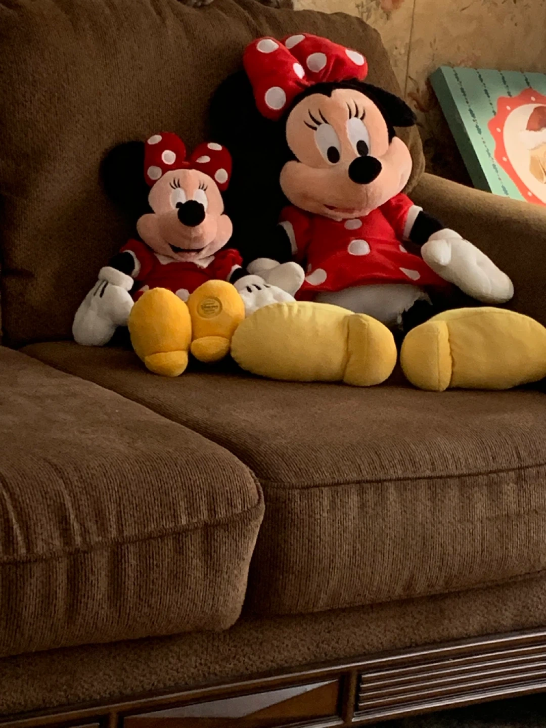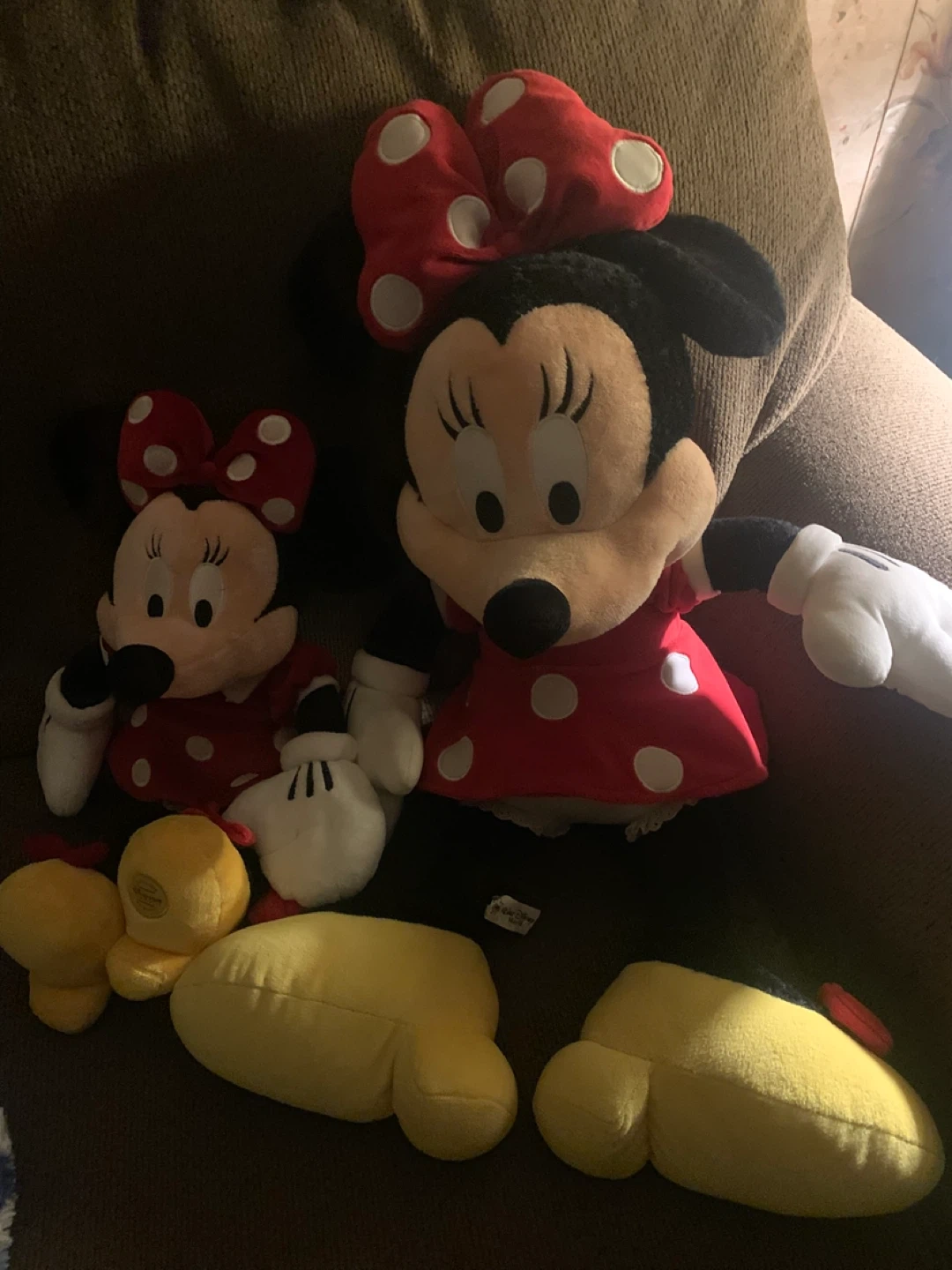 Two adorable Disney Minnie Mouse plush toys are ready for a new home. These soft and huggable pals are perfect for any fan. Both feature classic Minnie Mouse attire with red and white polka dots. Their bright yellow shoes add a cheerful touch!