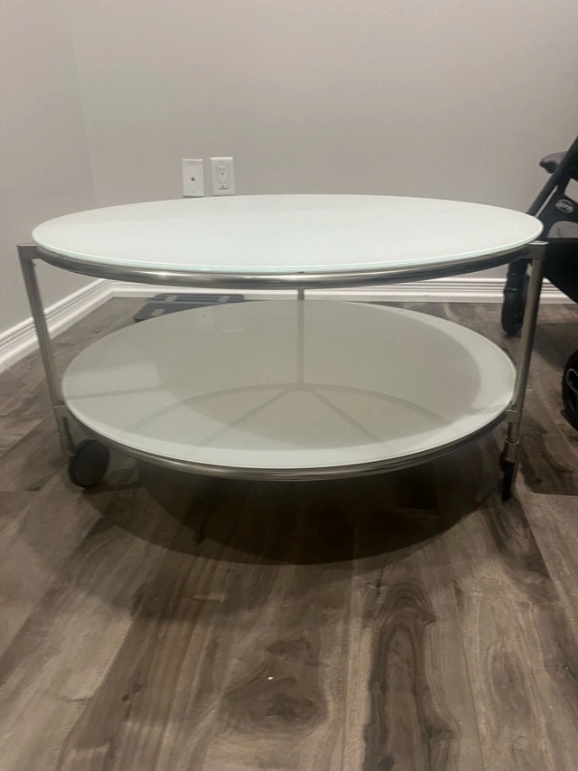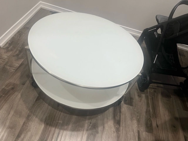 This round coffee table features a sleek, modern design with a white top and a chrome-finished frame. It also has a lower shelf for extra storage or display space. This table is in like new condition with no sign of wear.