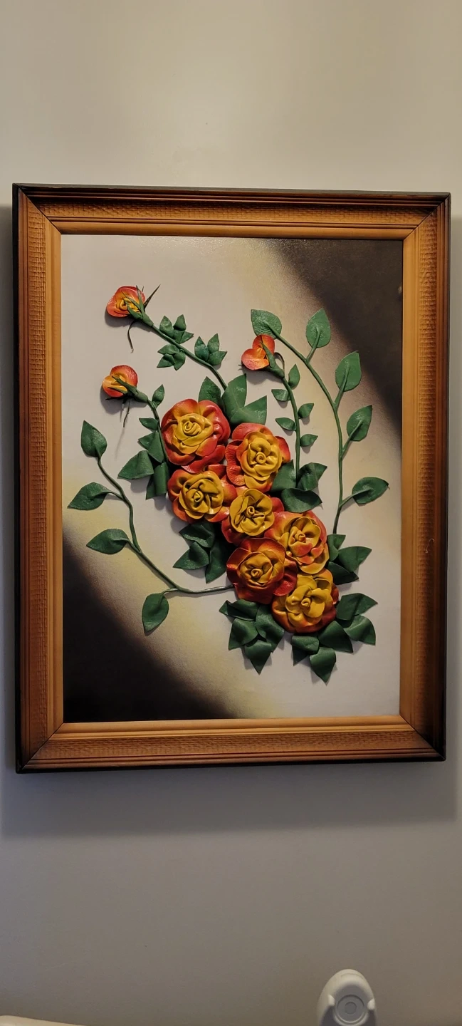 This is a framed wall art piece featuring a floral design with sculpted roses and leaves. It's finished with a classic wooden frame. Made with real leather materials beautifully designed picture.