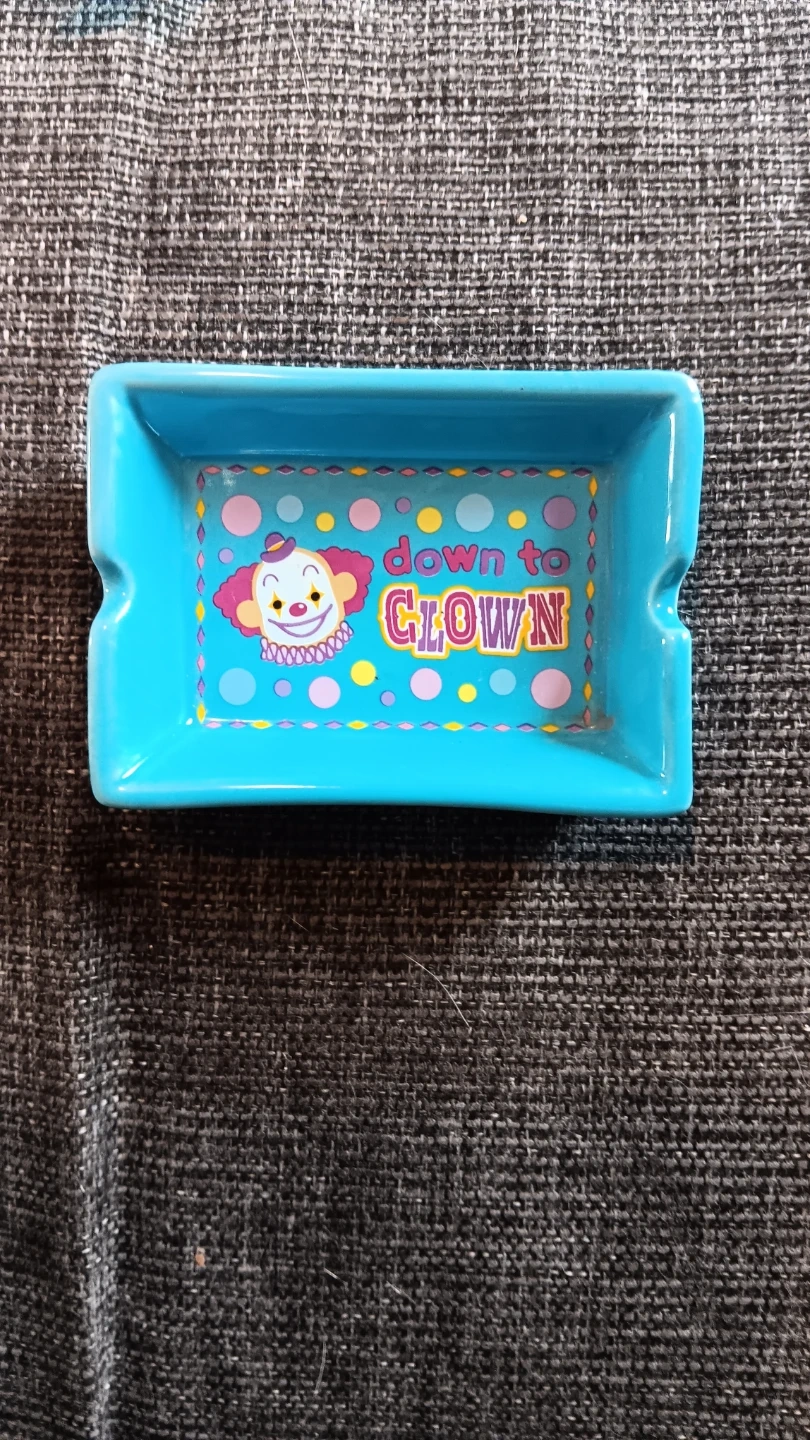Ceramic ashtray featuring a colourful clown graphic and the text 'down to CLOWN'. It has two notches for holding cigarettes. Perfect for a bit of fun decor!