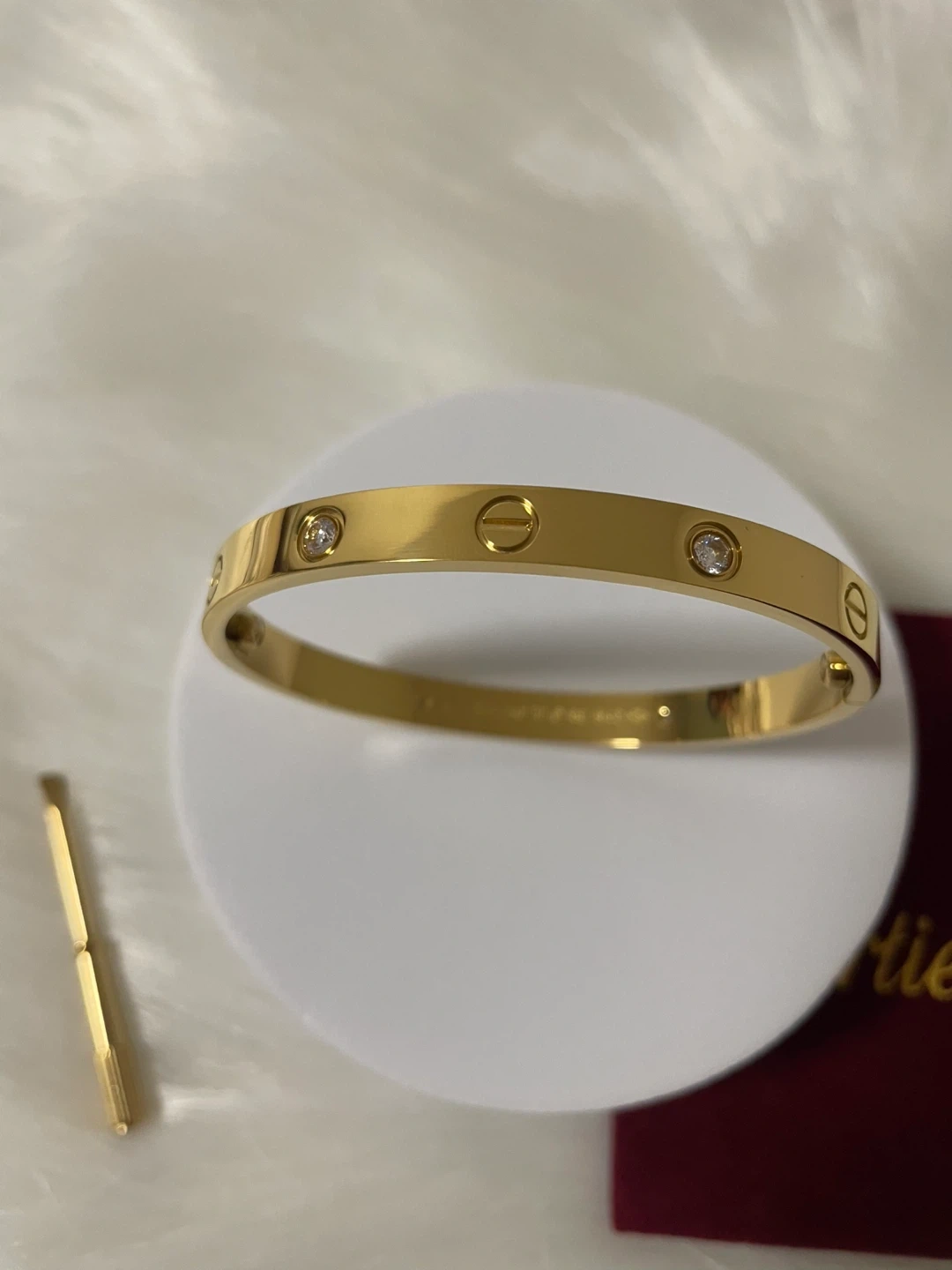 This is a Cartier Love bracelet in yellow gold with diamonds. It's a classic piece, perfect for everyday wear or special occasions. Includes the original tool and a velvet pouch.