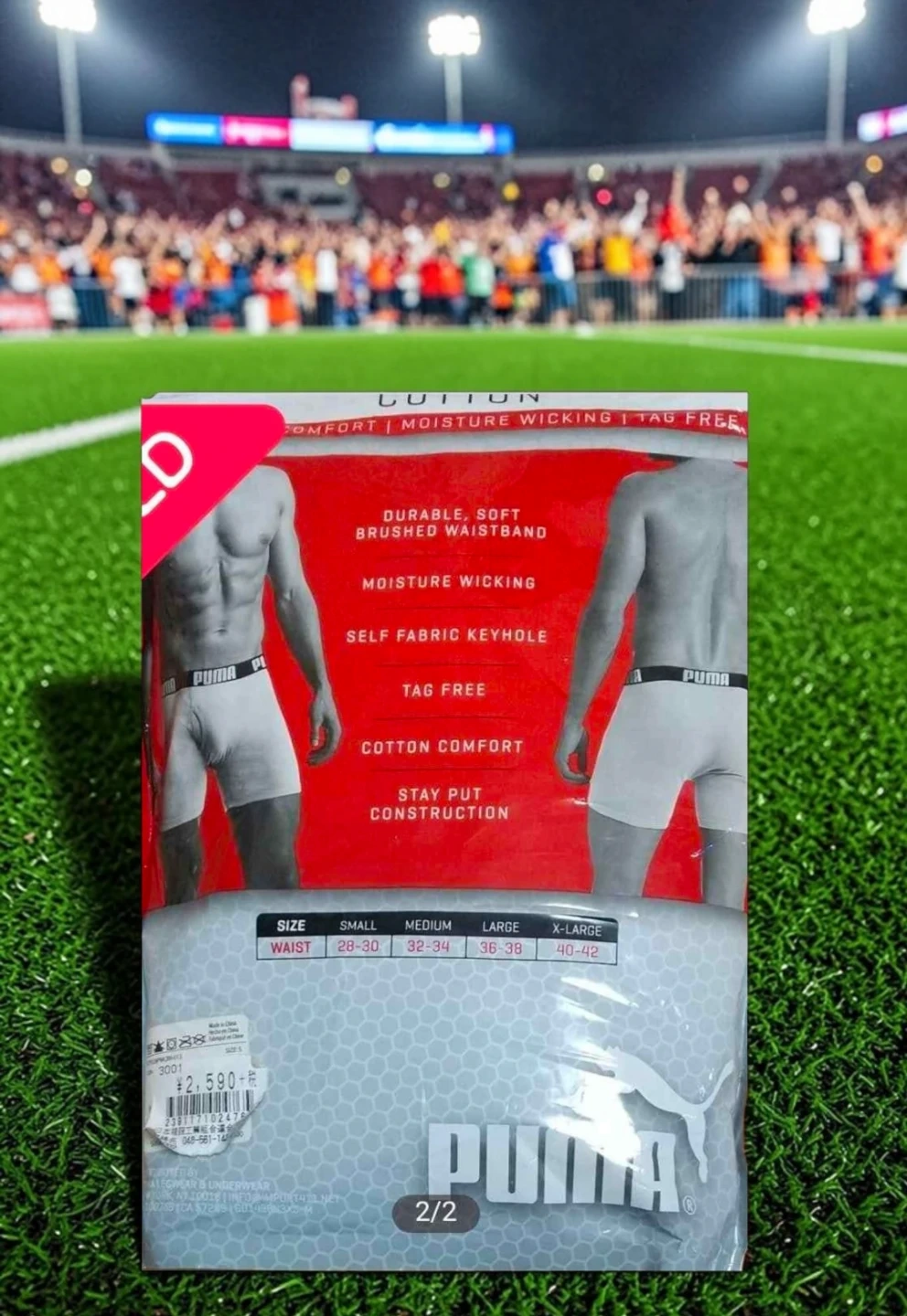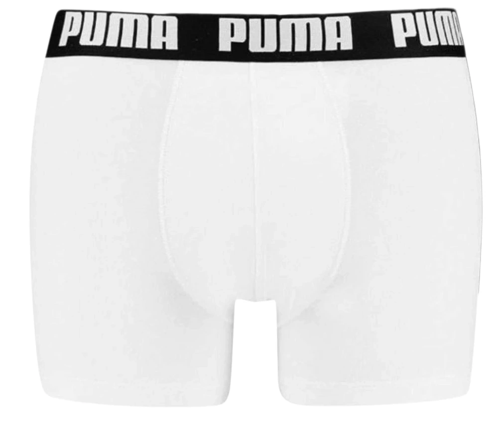 Puma men's boxer briefs in white. They're made with cotton comfort and moisture-wicking fabric. The waistband is durable and soft, and they're tag-free for extra comfort. Stay put construction.