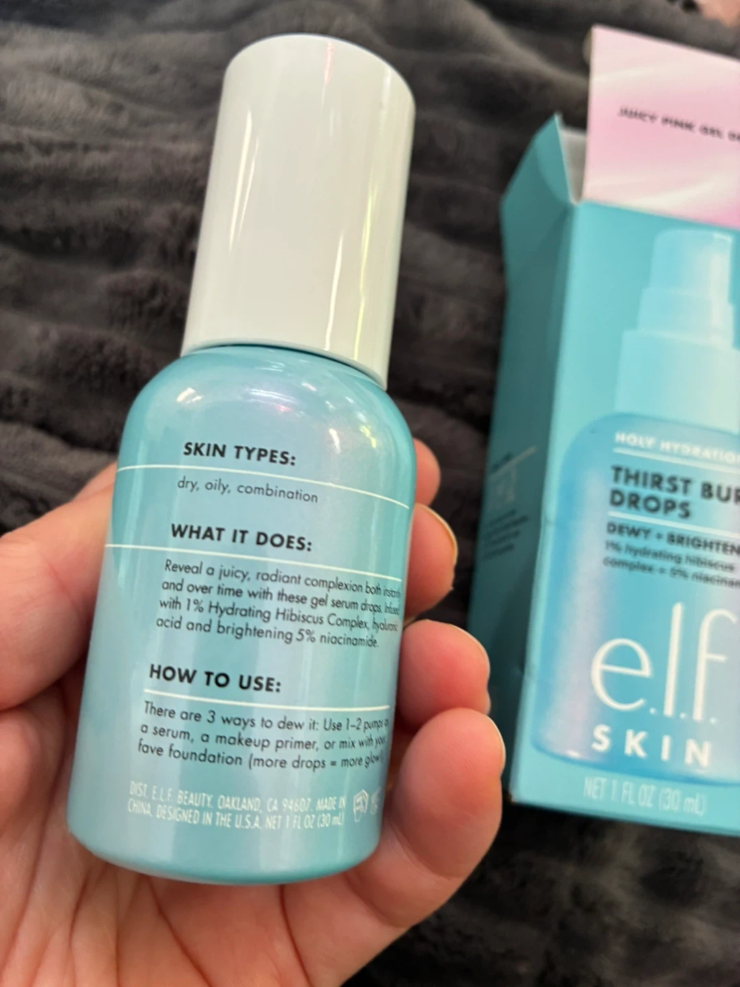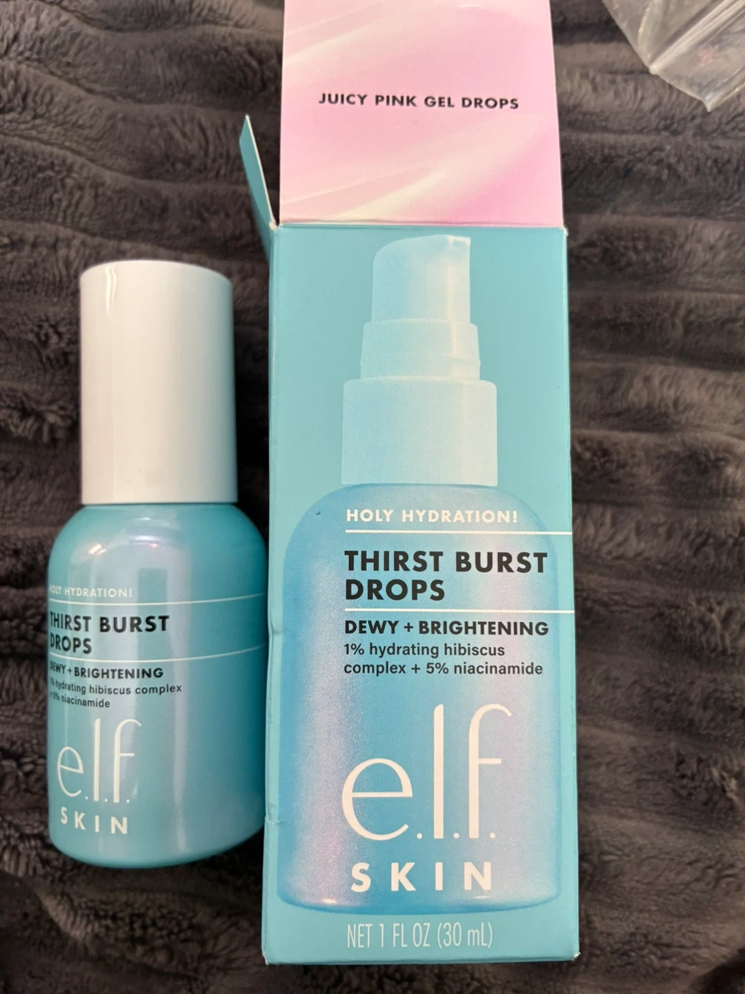 e.l.f. Thirst Burst Drops gel serum for dewy and brightening skin. It's formulated with 1% hydrating hibiscus complex and 5% niacinamide. Skin types are dry, oily, and combination. Net 1 fl oz (30 mL).
