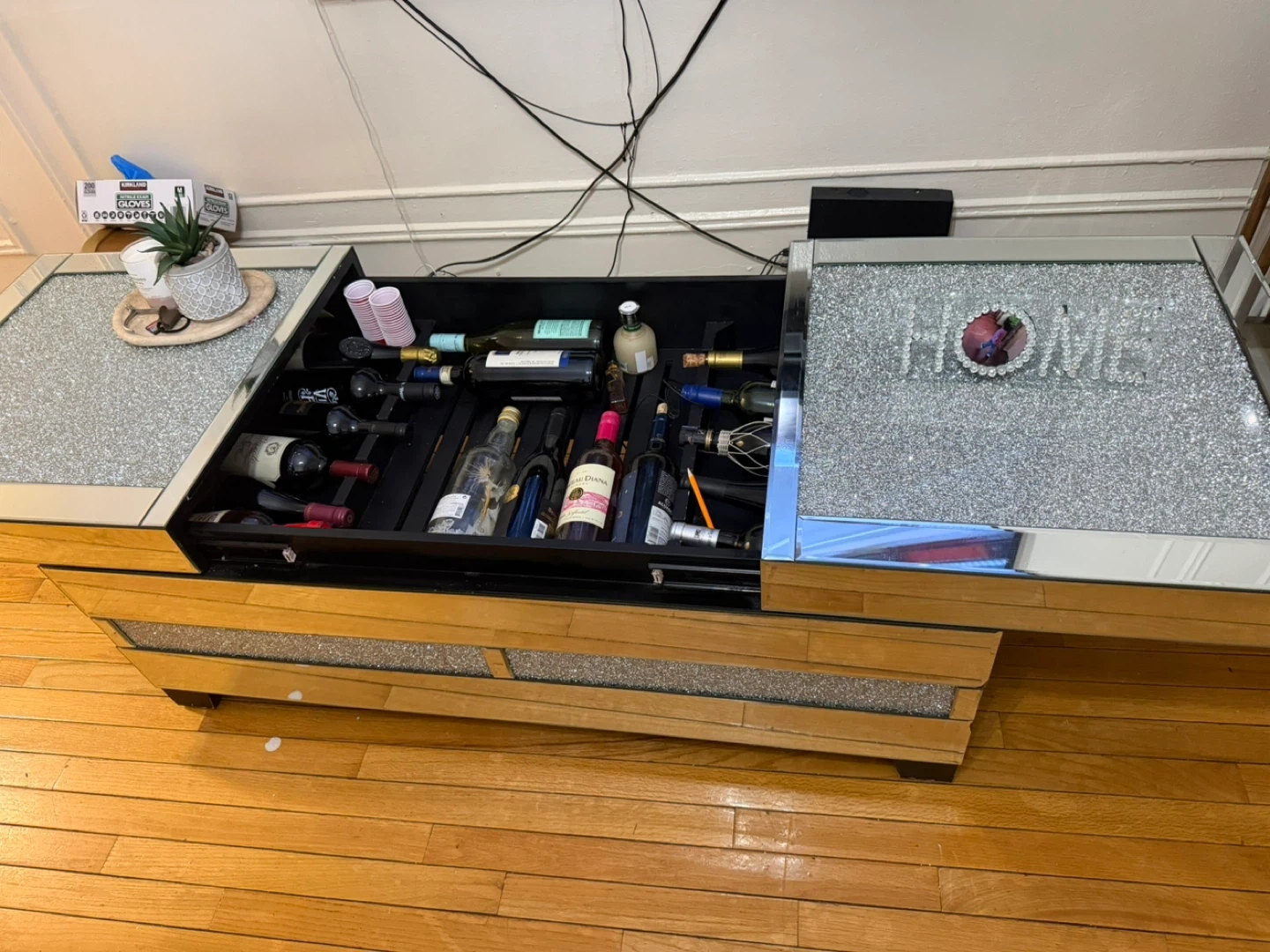Glamorous mirrored coffee table with crushed diamond accents. It's a stylish centerpiece featuring a built-in bar for wine storage. Mirrored wood construction.