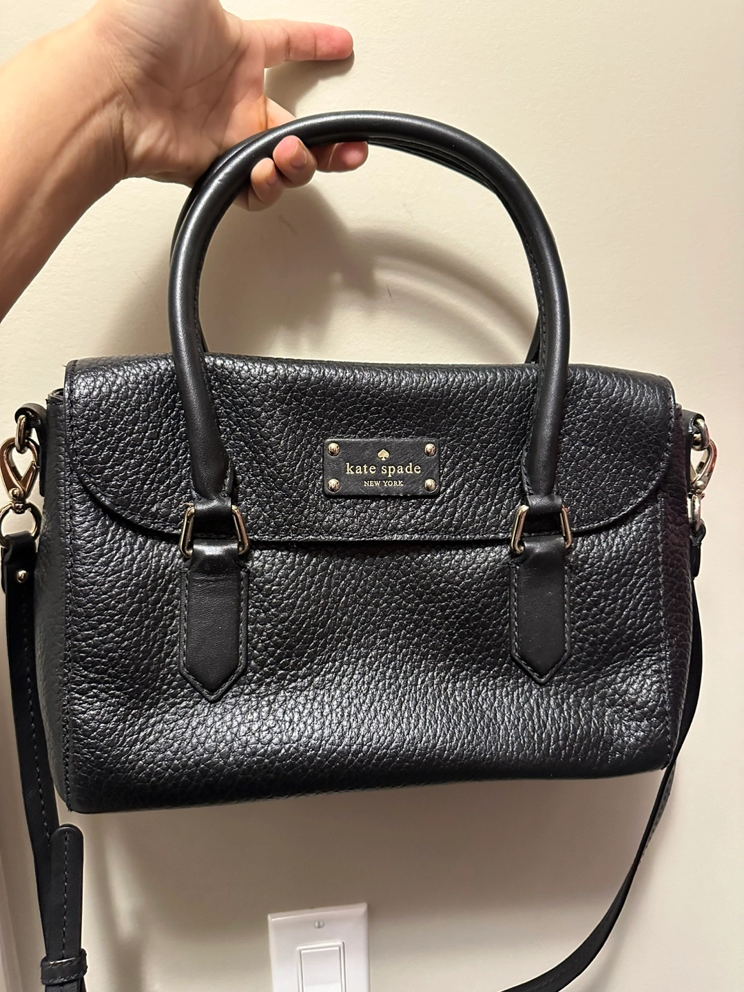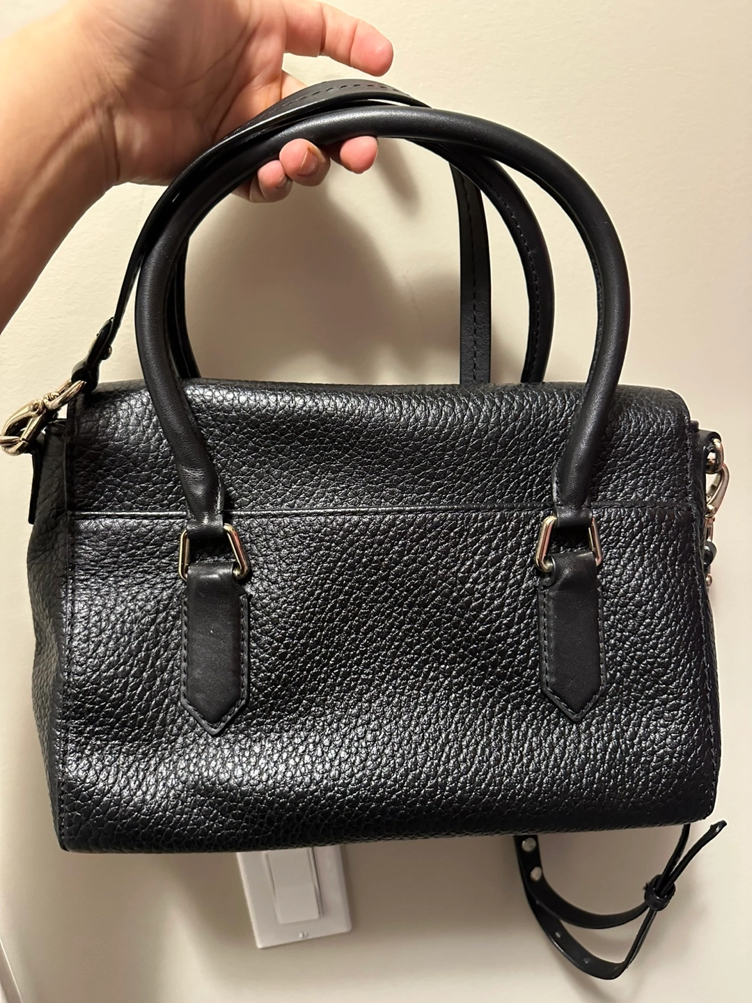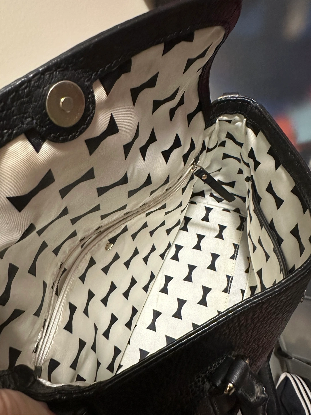 Black leather handbag with a top handle and an adjustable shoulder strap. Interior has a zip pocket and a small pocket. The bag is in good condition.
