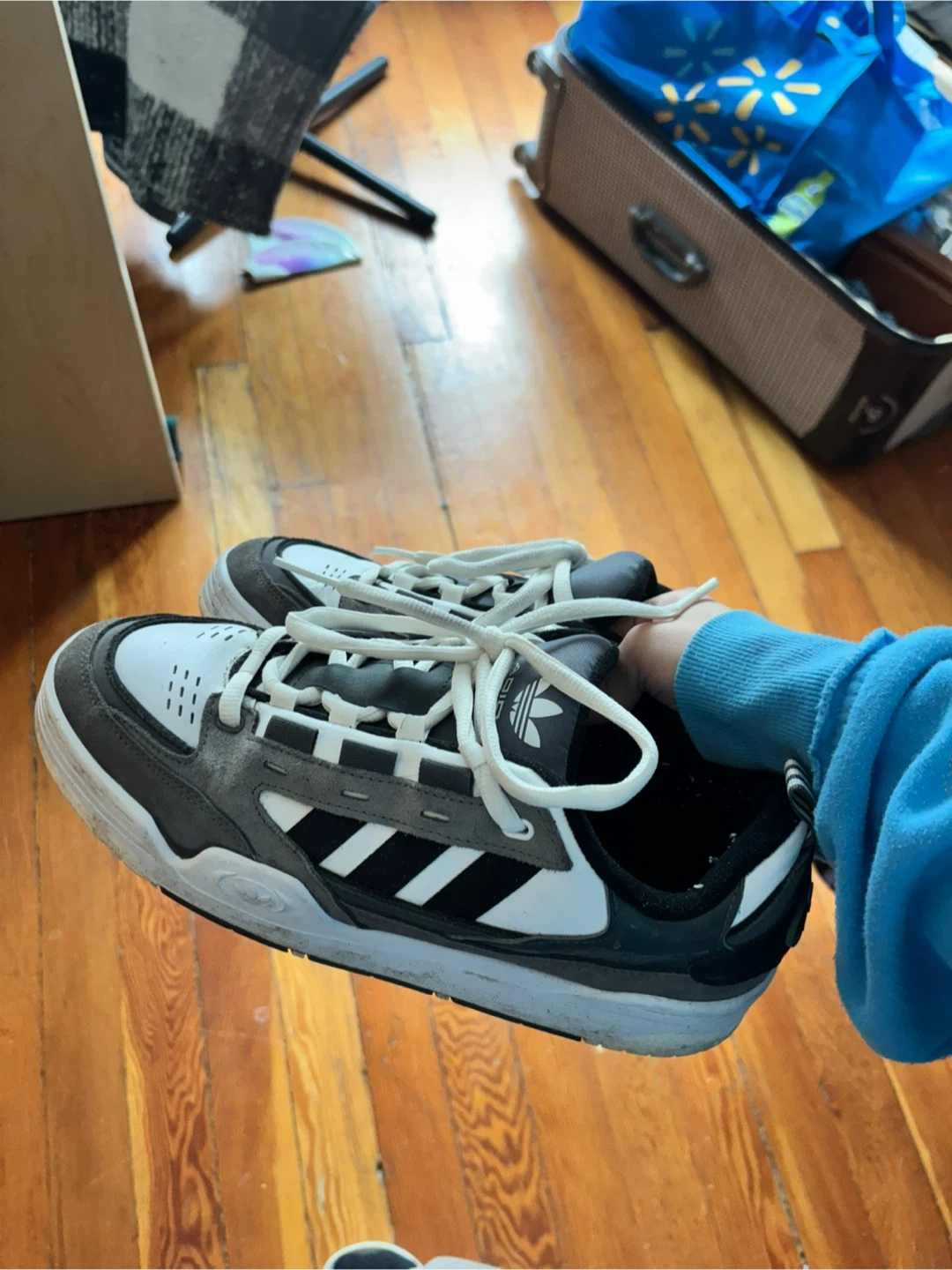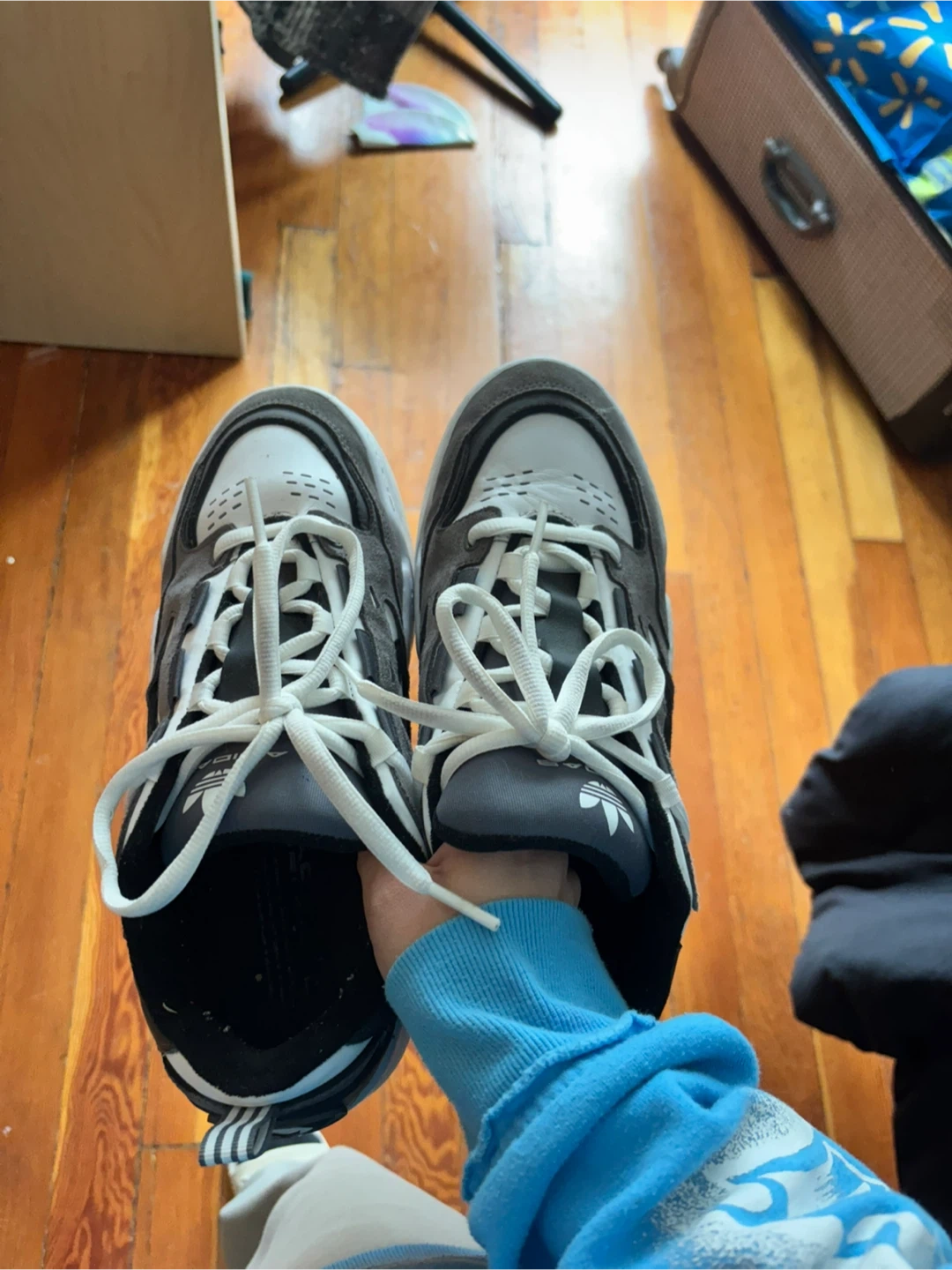 Adidas sneakers in a grey, white, and black colourway. US Men's size 12 (UK 11.5, EU 46, CM 30). Made in Vietnam. These shoes are great for everyday wear.