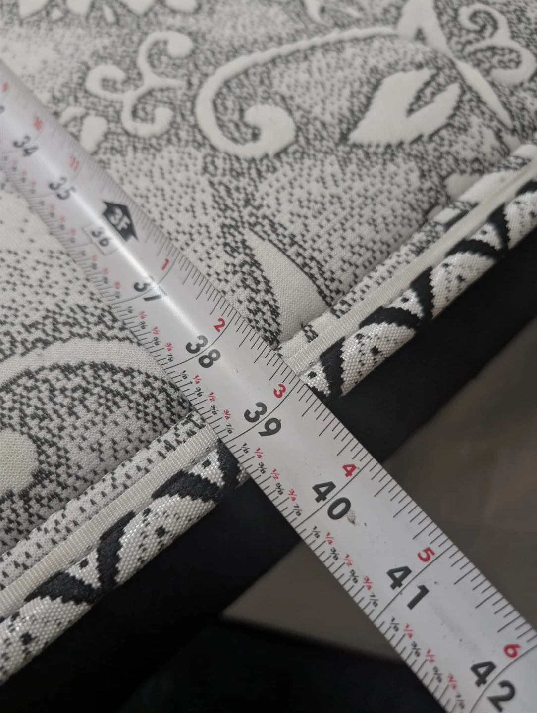 Black woven mattress with a white floral pattern on one side. Measures approximately 80 inches long and 38 inches wide. Height is about 6 inches.
