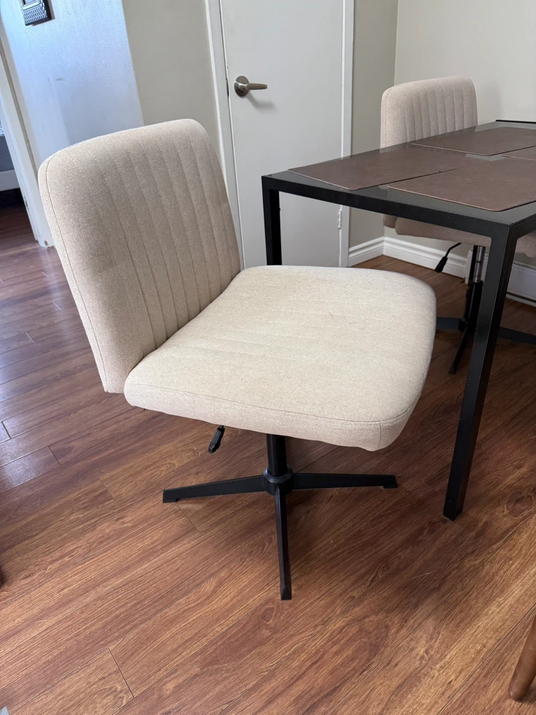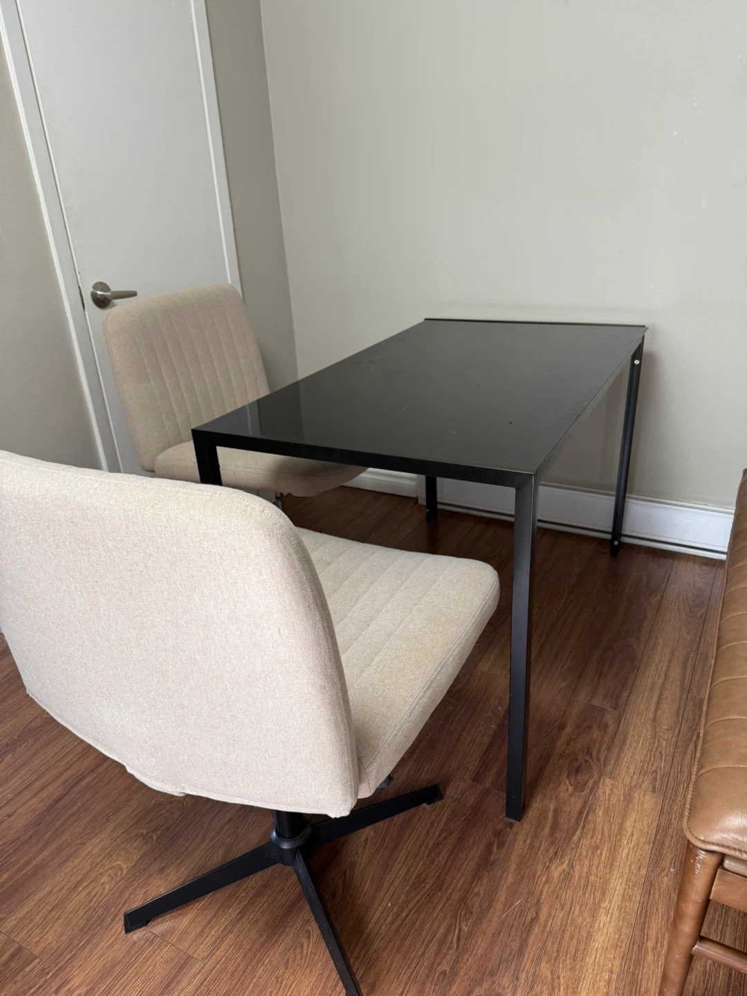Set a dining table black glass top and a sturdy black metal frame with two armless beiges chairs comfortably seats two to four people. This set is great for small apartments or as a breakfast nook table.