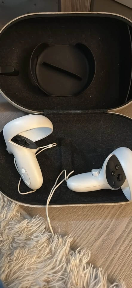 Cool Meta Quest 2 VR set for sale. Comes with the headset, two controllers, and a travel case. Everything you need for virtual reality gaming.