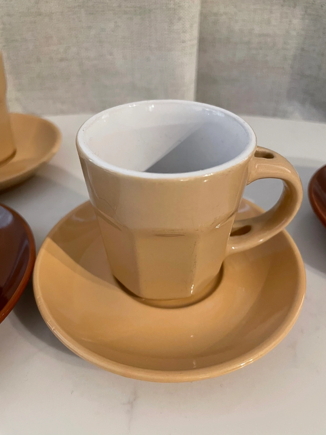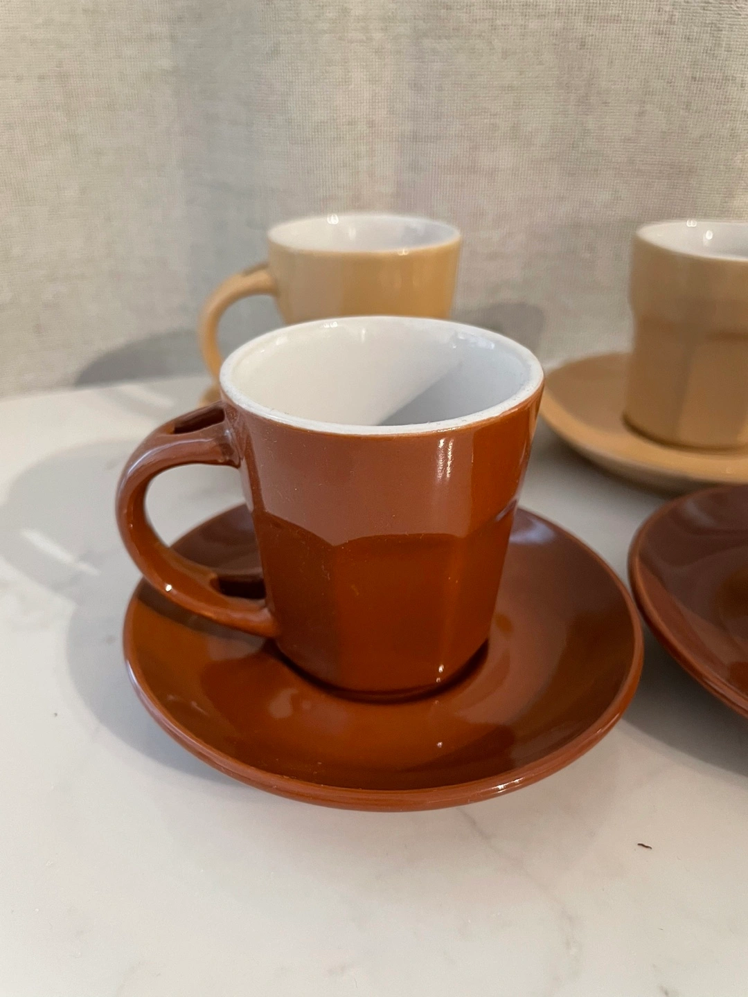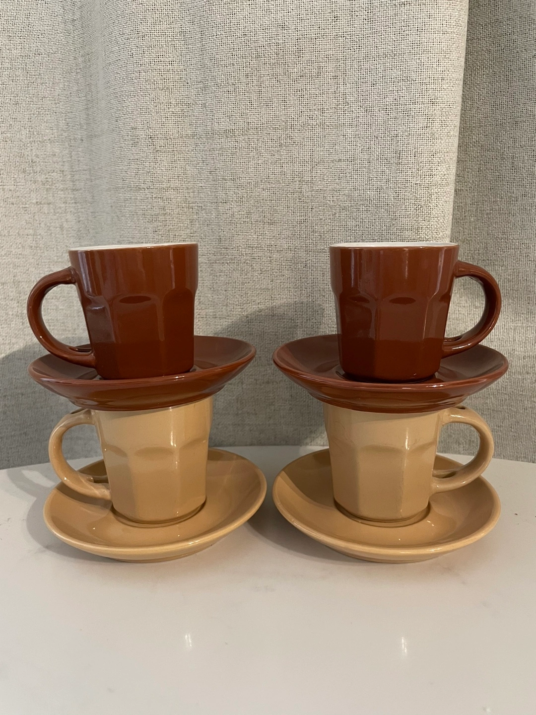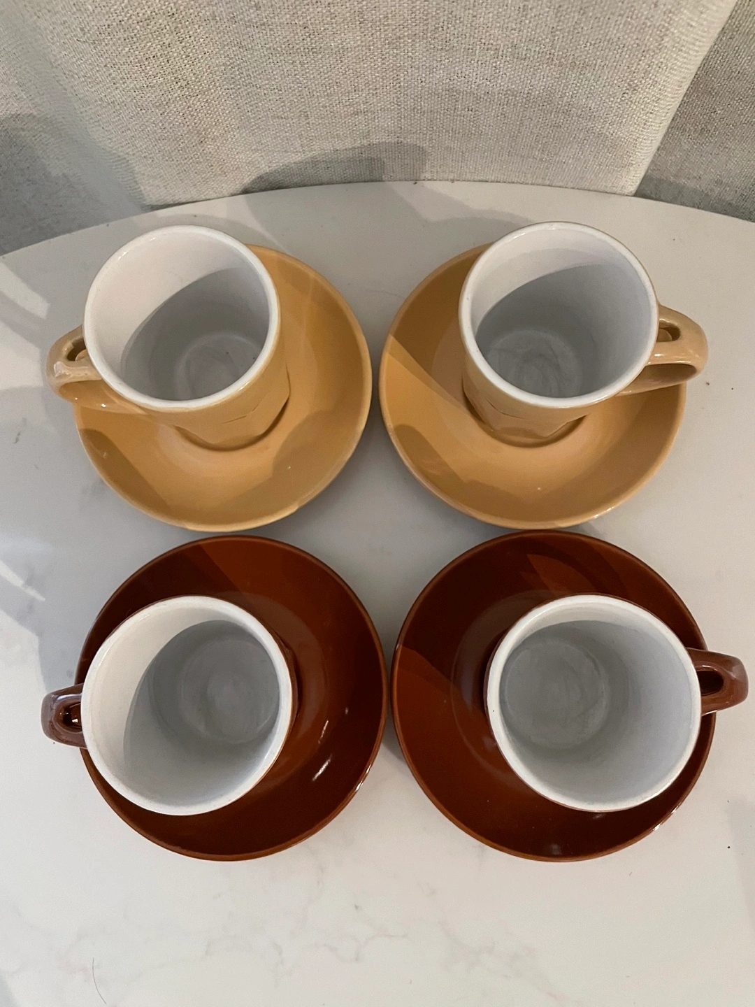 Set of four vintage espresso cups and saucers. Two are tan and two are brown. Pick up Liberty Village.