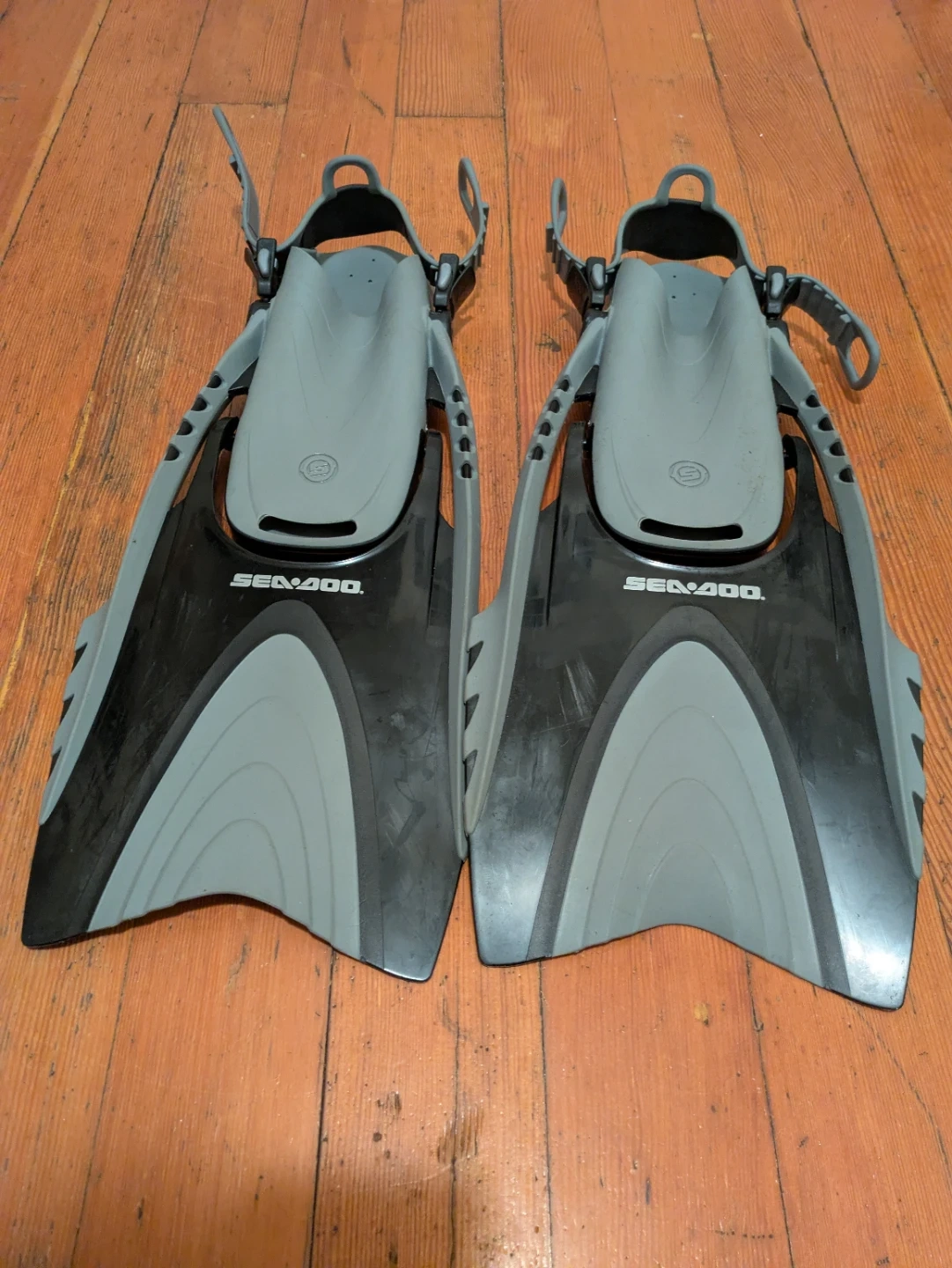 Set of Sea-Doo snorkel fins in grey and black. Includes a black mesh drawstring bag for storage and transport. These fins are size S/M, suitable for U.S. Men's sizes 4-8.5, U.S. Women's 5-9.5, UK sizes 3-7.5, and EU sizes 36-42.