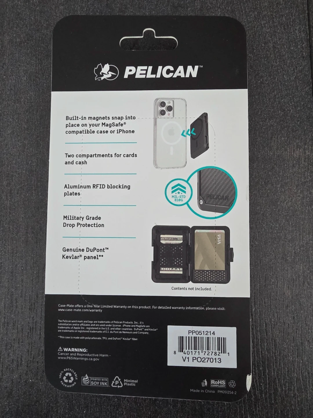 This Pelican Shield wallet features a genuine DuPont Kevlar panel and built-in magnets for MagSafe compatibility. It offers military-grade drop protection and two compartments for cards and cash, with RFID blocking. Made with minimal plastic packaging.