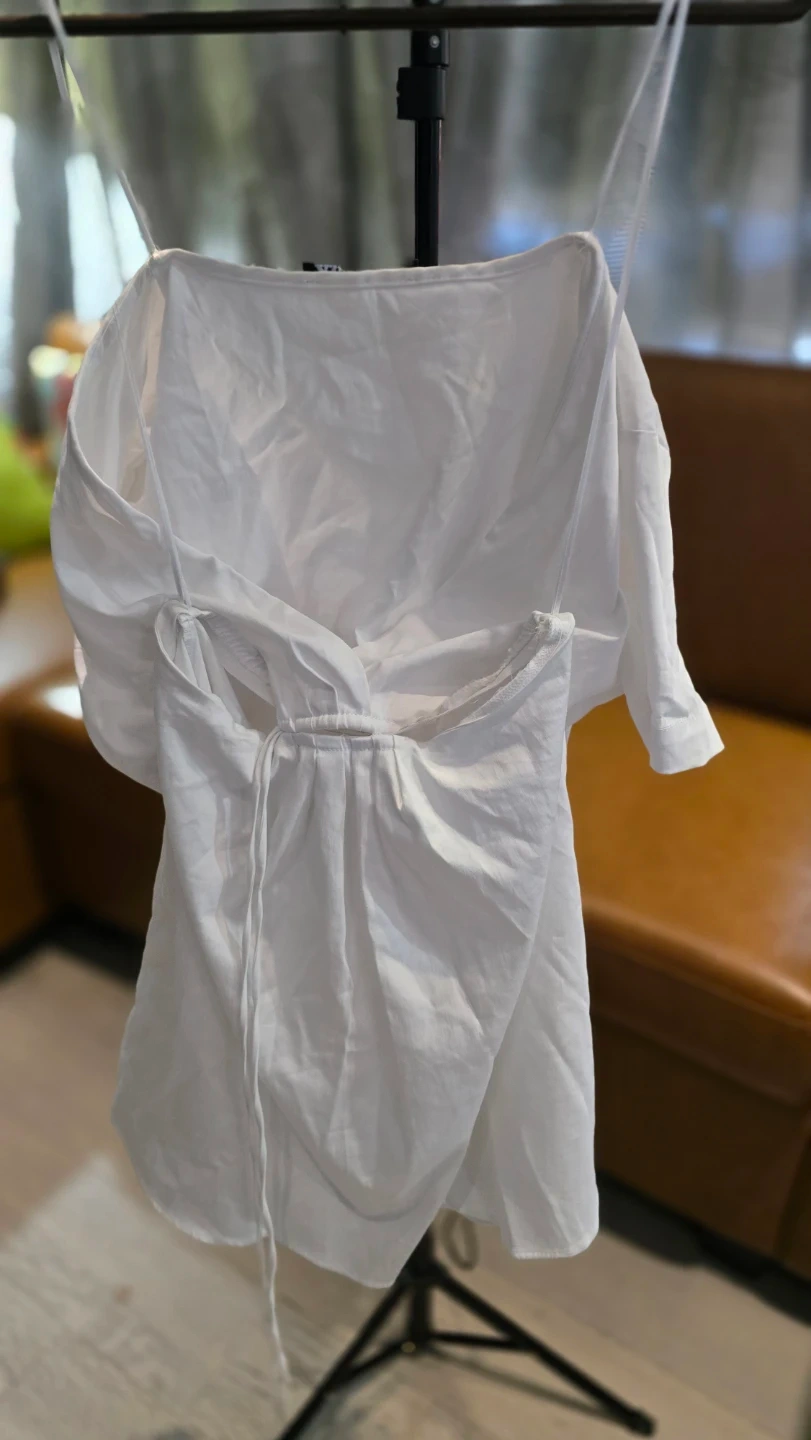 A flowy white mini detached gown It's made of a lightweight fabric and features a drawstring detail at the waist. is perfect for warm weather.
